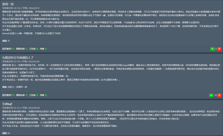 不是树洞,是非官方课程测评。这个网最近用的人不多了,所以评价都是几年前的评价 总得来说,他想给大家多讲授一些比较有技巧性和挑战性的问题(他们用的教材大概是GTM249和GTM250,但是有些人说他经常会额外讲述一些 Javier Duoandikoetxea 的 Fourier Analysis 的 note 里的内容?) 但是限于个人条件,内容难度和课时限制导致的讲的速度比较快,可能在听感上没有那么好(但是话又说回来了,这些内容究竟怎么讲能讲的比较好听呢)?但是如果单独讨论,实际上能讲的很清楚。 每次开课也都有十几二十个人选,当然肯定有中途退课的,但是中途退课并不是什么稀罕的事情,在北大除了实验课,其他课都可以上到一半退课,可以之后学期重新上,也可以不上这些课了。我之前还选了一个可能是社会学系最通俗易懂,面向大众的课程,结果还是退了,因为我背书能力和急就章能力(考试考写作文)确实一般,而且同一学期还有好几个专业硬课和别的背书课…… |
