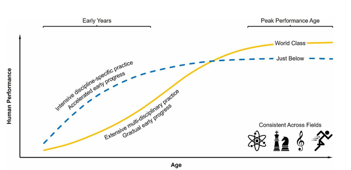 为什么会这样呢?研究者提出了三种假说来解释: 搜索与匹配假说:早期接触多个领域,就像尝试不同的“拼图块”,能帮助他们找到那个最适合自己天赋和兴趣的领域,匹配上了,才更可能爆发出最大的能量。 增强学习资本假说:在不同领域学习,能锻炼他们的灵活思维、识别问题模式、整合不同知识和方法的能力。这相当于为他们未来的深度学习积累了“学习资本”,让他们在专精一个领域后,学得更深、更好、更有创造力。 有限风险假说:过早过度专注于单一领域,可能带来风险:比如倦怠、受伤、失去兴趣、错过其他发展机会。早期进行多领域学习,减少了这些风险,让职业生涯更可持续,更能坚持到绽放的时刻。 |