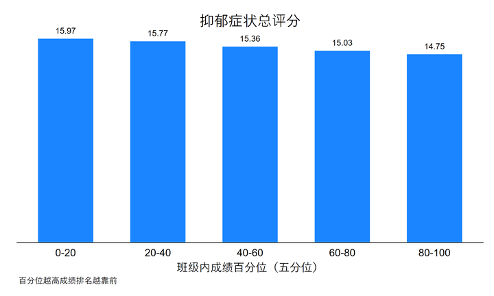 可以看到,从班级的最后20%,到40%,再到60%、80%以及最高20%,抑郁总评分总是越来越低的。这说明了一桩事实——不管在哪一个区间内,成绩略好的学生总是比成绩略差的学生,要更快乐一点。 所以归根到底,选择快乐地倒数还是抑郁地第一,就像20年前那句话“选择在自行车上笑而不是宝马车上哭”一样,是在一个拧巴的组合上做了一个不太可能在现实中出现的组合。 给孩子选了倒数,大概率同时给孩子选择了更抑郁的学生生活,纯属自欺欺人。 |