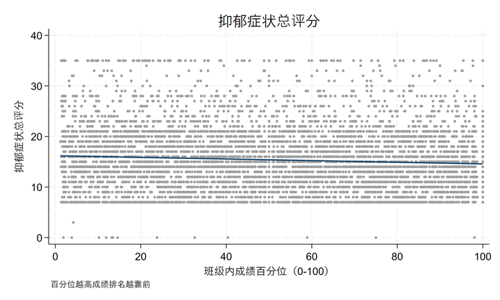 加总以上指标,可以计算出学生的“抑郁分数”。 同时学校会提供每个学生的学习成绩—— 期中考试成绩由被调查学校直接提供,非学生自填。变量 w2chn/w2mat/w2eng分别表示语文、数学、英语的原始得分 。变量w2upchn/w2upmat/w2upeng分别表示语文、数学和英语的满分。 因此我们可以用真实的成绩算出每一个学生在班级里的排名,并将这个排名和学生的抑郁分数对比,可以得到下图: |