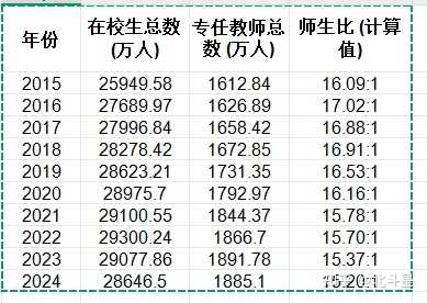 注:师生比 = 在校生总数 / 专任教师总数。此为根据官方数据计算的宏观师生比,与公报中分学段数据可能存在微小出入,但更能反映整体趋势。整体持续优化:全国总体师生比从2015年的16.09:1 改善至2024年的15.20:1。这意味着平均每个教师负担的学生数量减少,标志着教育资源配置效率和教育质量的基础条件得到了实质性改善。各学段情况:各学段的生师比也呈现出积极的优化趋势。小学阶段生师比从2015年的17.05:1(该年公报原始数据)改善至2024年的16.06:1。初中阶段生师比从2015年的12.41:1(该年公报原始数据)改善至2024年的12.98:1。普通高中生师比从2015年的14.01:1(该年公报原始数据)改善至2024年的12.70:1。高等教育生师比(以普通本科学校为例)从2015年的17.73:1(该年公报原始数据)变化至2024年的17.14:1。 |