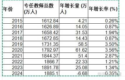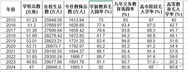 发挥知乎优良传统,用数据分析说话、理性讨论,实事说话。所有数据均来源于官方正规。核心是通过数据回答能不能养活,而不是工资高低。一、近十年教育发展基本情况。 弄清楚教育基本情况,是分析问题讨论问题根本,为此我系统分析了教育部公布最近十年教育公报,提取核心关键数据,如2024年教育发展概况,全国共有各级各类学校47.00万所,在校生28646.50万人,专任教师1885.10万人。学前教育毛入园率92.00%,九年义务教育巩固率95.90%,高中阶段毛入学率92.00%,高等教育毛入学率60.80%?。 2023年教育发展概况,全国共有各级各类学校49.83万所,在校生2.91亿人,专任教师1891.78万人。学前教育毛入园率91.1%,九年义务教育巩固率95.7%?。 2022年教育发展概况,全国共有各级各类学校51.85万所,在校生2.93亿人,专任教师1880.36万人。学前教育毛入园率89.7%,九年义务教育巩固率95.5%? 2015-2024年全国教育事业发展核心数据年鉴 |