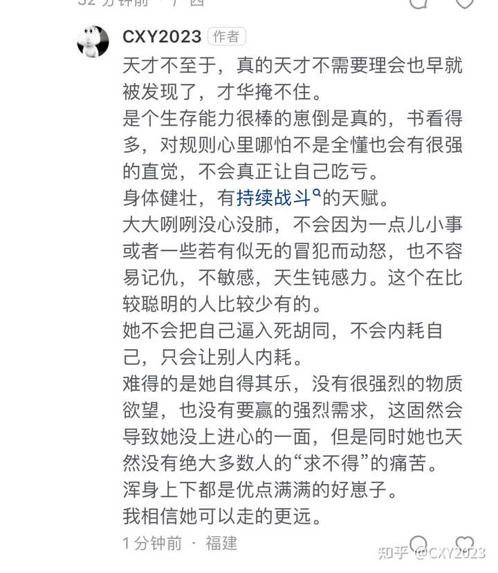 刚朋友给我看她朋友的女儿发给母亲的聊天记录,贼吓人,大概是女儿要去同学家过夜不回来妈妈不肯,然后女儿各种发疯文学…(搁我也不肯,女孩子不许去别人家过夜这在我这里是卡死的,所以她从没动过这念头),说起来,这孩子这个年龄应该在叛逆期,她就没叛逆期………虽然不太听话,但是她从会走路就没听话过,算不上叛逆。 这是叛逆期迟到了? ———————— 经提醒,才后知后觉想起来,我女这样应该也有福建高考本身就没其他省份那么卷的原因。 也不只是我女儿浪,她们都挺浪的。我女最好的朋友,重点班的老班长,万年老二,她三天两头在微信里跟我女儿分享小说游戏啥的,追各种剧本… 我外甥女,今天大姑姐家的两个女儿回国,她们几个小姐妹聚会一下,过几天又要出去旅行了。重高高中生,她们社团玩的飞起,前面学校还给她们拉一车去参加什么合唱比赛,一去就是好几天… 也不止我女,她们这些人都这样,从来没发现谁写作业写到11点啥的。最近我女的班主任听我说我女发愤图强在追进度每天写到11点,还特地打电话跟我说要给她保证睡眠,10点前得去睡觉,早上不要早起,6点多起来就可以。。 也有卷的孩子,但是总数还是少,我没见过…福建高考人数少,很多学不会的,就出国了。。。 据说别的省份家长跟着学校一起带着娃卷,福建这边学校要是卷家长会跑去教育局投诉。。 大家都不学,等于大家都学了,反正高考是省内竞争。 ———————— 评论区指出,娃应该是a娃 崽确实是智力偏高的a娃,双a,比如她小时候不哭是因为对环境不敏感,神经也不敏感,比如饿了冷了热了等,她的感受没有别的婴儿那么深,所以她没觉得不舒服,加上天生就是安全型的宝宝,所以她快乐的没心没肺,普遍没啥压力的a娃性格都如此。比如别人给她一对一讲题,她能直接唱起歌来。她对学校对老师无感,也是a娃特有的“目中无人”,她们自己跟自己玩的太快乐了。 这种孩子呢,自学能力非常强,她几乎所有的都是自学来的,嗯,我也是。 所以我带她学地理可以三下两下把地理弄到98分。但是我的执行力也有问题,所以我没办法持续带她。。。 高中的学习非常非常吃基础,特别是语文跟英语,都懂的哈。这是需要长期执行力的事儿。 所以就是我也蛮内疚的,觉得如果给她换一个超强执行力的引导者,她其实可以很优秀的。但是我做不到。 主要表达的是这个。 不过呢,虽然经常性被她学校老师打电话请家长整的灰头土脸的,偶尔也会自我怀疑一下是不是要拽一拽她,所以时不时到重要的考试之前会开始焦虑然后找她麻烦,她就回魂了。小学到初二年一直是这个模式,小学能从70多爬到第一,是她基础确实好,阅读量高的小朋友再摆烂基础都在那。而且小学平均70多那不是中下,那就是差生…班级最后几名那种。比她差的只有那些在国外读书转学回来的那几个渣娃,人家那没学过中文,语文考7..8分那种。她小学分数烂主要是,英语烂我理解不了,我想不通,因为她口语非常非常好,所以70多分我至今也没想明白。语文烂是因为她觉得写阅读理解题跟作文题字太多,所以她可以阅读理解题写两个字那种。。。真写两个字…作文干脆经常不写。数学烂的原因我大致猜过去就那些,比如会,但是把答案写到别的题里去,会,但是跳题了,会,但是算错了… 所以会出现日常摆烂大考出奇迹的情况,因为大考她知道我的底线,真考砸了我会动手揍她。 可我也不能老揍她吧!揍她一下,我的血压稳不住,老命要紧。 气人不,可气人了。可是性格又实在可爱,对吧! 身体健康,没心没肺,我有时候想,这货去搬砖,都能比别人多搬两块。不读书也不是不行…而且她巨恋家… 她的人生理想就是一辈子呆在我身边,然后挣几千块就行。 可是有时候又会觉得,如果她可以认真点,努力点,是不是可以过的更丰富一点呢? 我们这个时代,想饿死真挺难的,她是那种只要有吃的就能浪的飞起的铁憨憨。但是吧!人还是要追求更多样的,更丰富的,去更多的地方,认识更多的人,做对或者做错更多的事。最后才回家吧~ 所以,还是得好好读书。还是可以再期待一下,明年中考看成绩吧~ ———————— 说凡尔赛的,我想想,其实确实有点得意。 但是我这人吧,只要是我的人,我的孩子,我的家人,我的朋友,那都只有好的,没有不好的。不好的只是小缺点,改不改都不影响且可以拿出来吐槽调侃的那种。 所以小朋友脾气不好那是好事,不会被人欺负。 小朋友脾气好那是好事,不会欺负人。 小朋友诚实守信那是好事啊,人品好,老实。 小朋友会说谎骗人那是好事啊,人家这叫聪明机灵审时度势。 小朋友不爱学习但是身体健康爱护家人善良快乐。 小朋友不聪明但是做事稳妥细致待人宽厚善良。 朋友爱慕虚荣但是积极努力实现自己想要的豪车豪宅,太厉害了,是可以抱大腿的对象。 朋友颓废不努力但是温柔善良会照顾人 人吧!只有你愿意不愿意看到她好的,你愿意看到好的,那就都是好人。你愿意看到不好的,那就人间不值得。 我觉得人间挺值得的 铁憨憨闺女也是最可爱的,自然是最好的,那我自然要得意一下。 闺女是学霸那是第一好,我得得意一下,闺女不是学霸那是第二好,因为她喜欢留在我身边当个妈宝女,那还是可以得意一下~ 就别挑毛病了,好好过日子要紧。 |