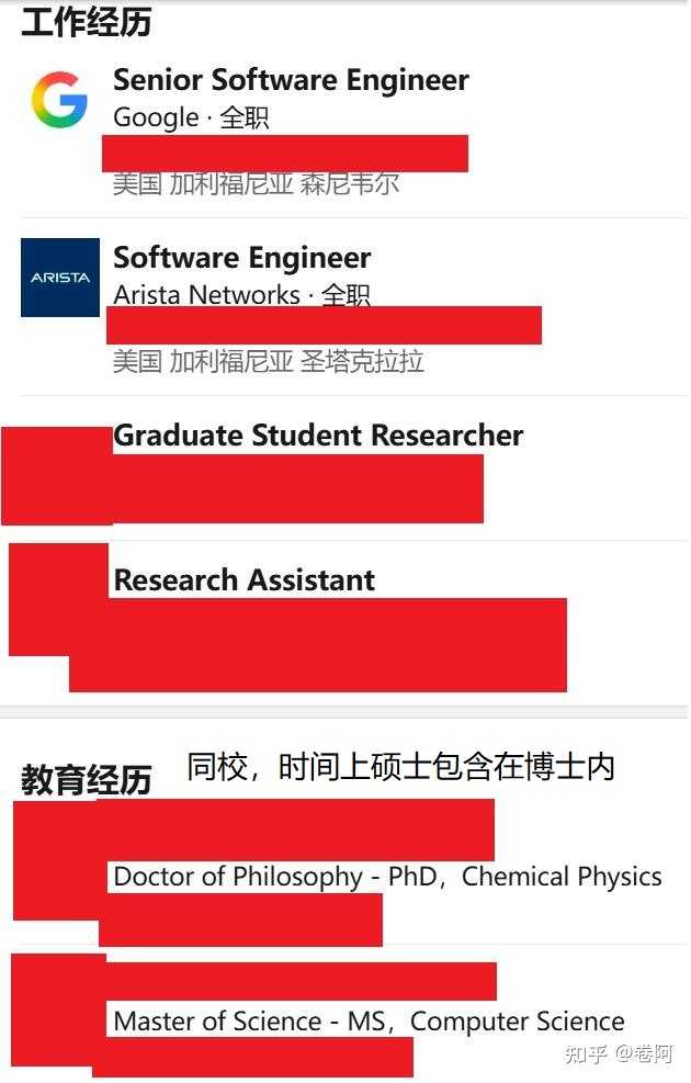 这不是我去美国的本科同学的常见操作吗?念带奖学金的物理学或化学博士学位,同时念一个计算机硕士,毕业后在湾区找一份工作。随便去领英截个图,现实中认识的同学,码就打得厚一点了。 |