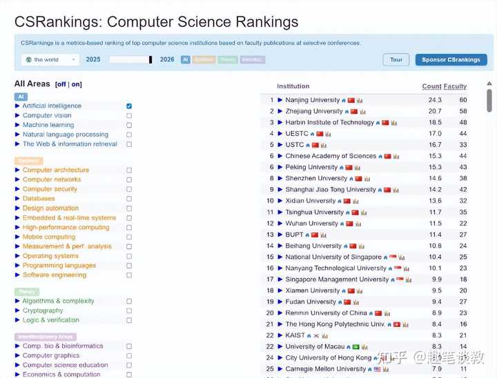 其实想要看到“南大第一”这个结果,也不是太容易,我们来实操一下。 首先打开这个网页:csrankings.org 左侧边栏是控制台,需要勾选正确才能看到“南大第一”的结果: Artificial Intelligence: 在 "AI" 大类下,只勾选 Artificial intelligence 这一项。 注意:不要勾选 Computer vision, Machine learning 等其他选项,否则是综合排名。新闻报道的“AI学科排名”特指这一细分项。Regions (地区): 点击下拉菜单,选择 World (全球)。Years (年份): 这是最关键的。新闻中的“23.7分”指的是近期的特定时间窗口。 把滑块调整到 2025-2026 或者单独的 2025(取决于榜单是否已录入 2026 年初的数据)。 我试了一下,结果是一样的: |