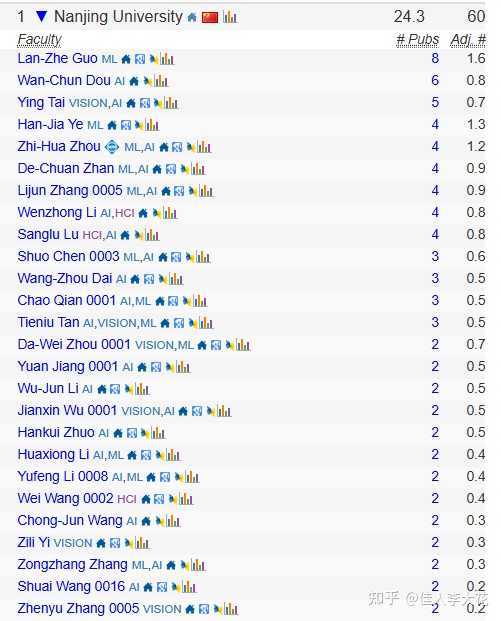 CSRankings 与常见的 QS、U.S. News 或泰晤士等综合性排名不同,它不看学校声誉,不看教学质量,也不看毕业生薪资,是一个“纯学术、唯产出”的榜单。 唯一指标:顶会论文 它只统计一所学校的全职教授在计算机科学各领域顶级会议上发表的论文数量。 在人工智能领域,该榜单有着非常细致的分类(CCF-A类为主): 人工智能(General AI):AAAI, IJCAI —— (注:这是南大登顶第一的核心板块)计算机视觉:CVPR, ECCV, ICCV机器学习:ICML, NeurIPS自然语言处理:ACL, EMNLP, NAACL数据挖掘:KDD 它的计分不看第一作者和通讯作者,而是简单粗暴的按人头平均分配。 假设一篇发表在 AAAI 上的顶会论文,分值是1.0。 如果作者是1名南大教授,那南大得分1.0; 如果作者是2名南大教授,那南大得分是0.5+0.5=1.0; 如果作者是1名南大教授 + 3名南大学生,那南大得分是1.0/4=0.25(学生不算分) 校际合作的话同理。 然后我们可以看一下南大榜单里这些发文章的“主力”: 第1名 Lan-Zhe Guo (郭兰哲): LAMDA 实验室的准聘副教授。他是周志华老师的博士生(2023年毕业),刚留校不久,正处于科研产出的爆发期(“当打之年”)。 第4名 Han-Jia Ye (叶翰嘉): LAMDA 实验室的副研究员。 第6名 De-Chuan Zhan (詹德川): LAMDA 实验室的教授,周志华团队的资深骨干。 第7名 Lijun Zhang (张利军): LAMDA 实验室的教授。 第10名 Chao Qian (钱超): LAMDA 实验室的教授。 哦,当然,还有第五名的周志华老师自己。 |