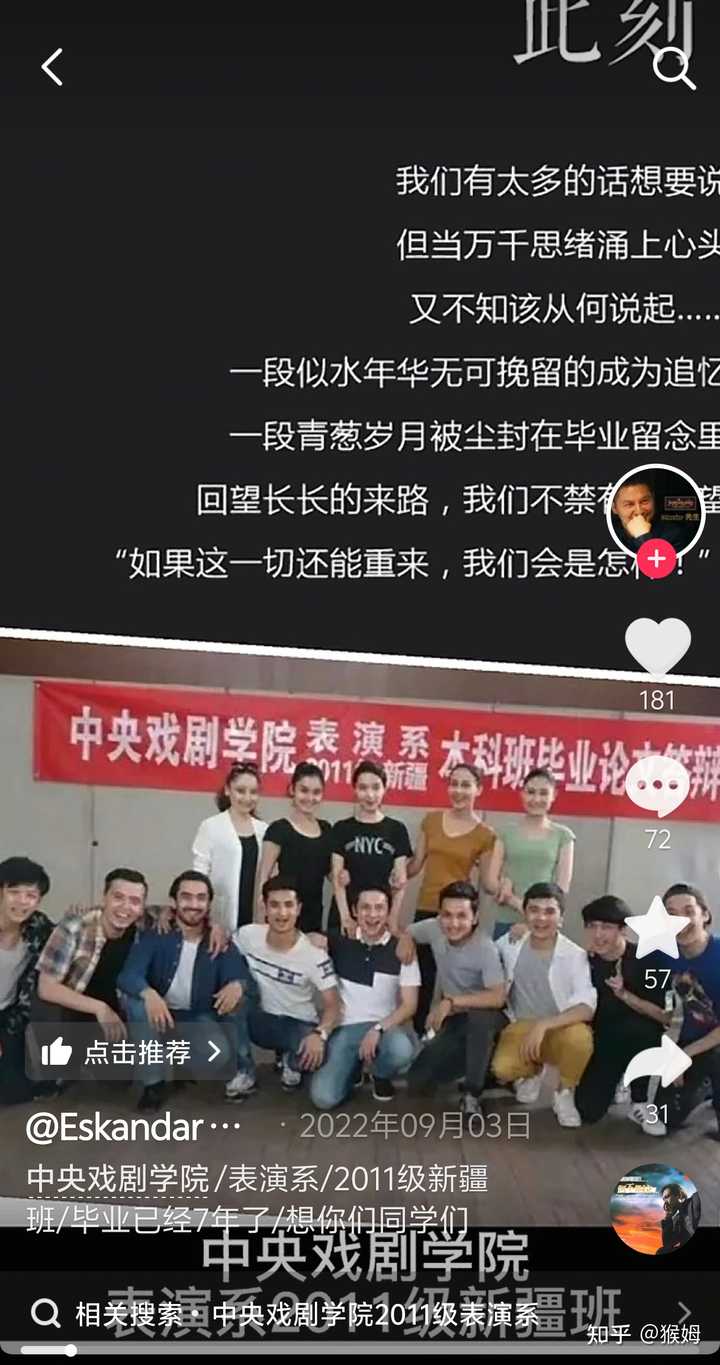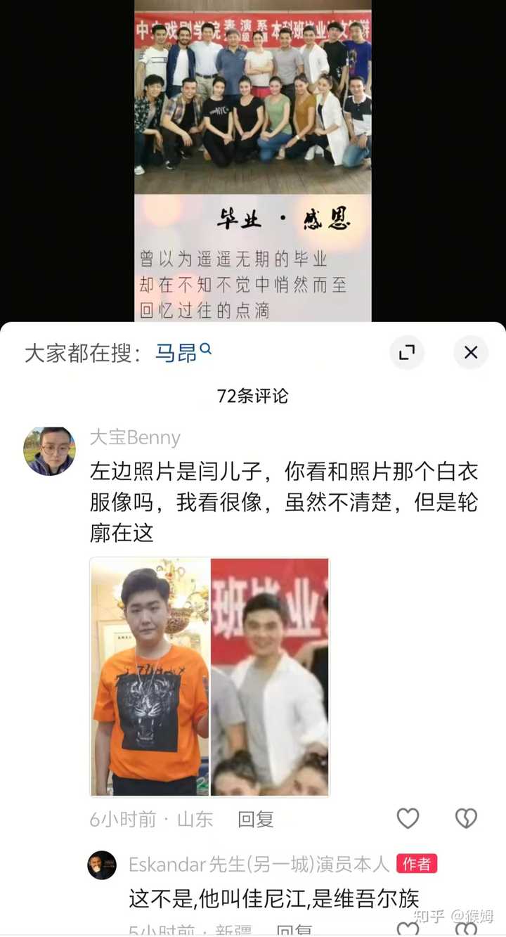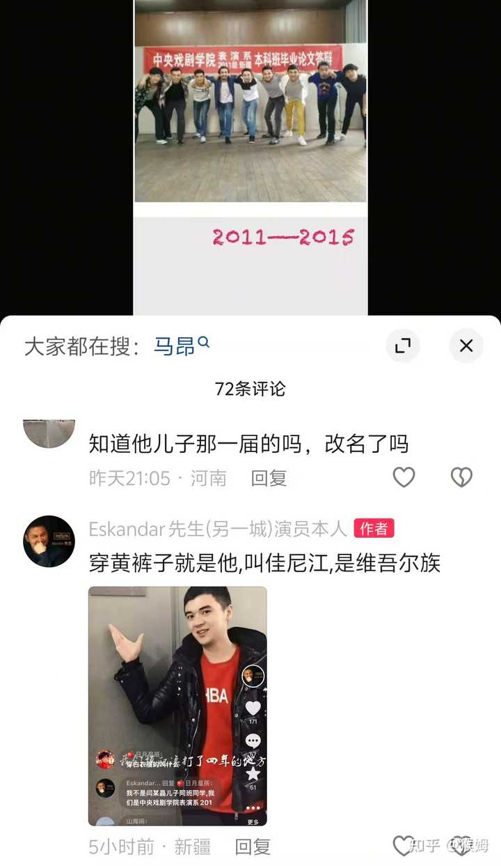 这件事的神奇之处在于,全网一直在说,这是「闫学晶自己在直播里透露的」,甚至很多媒体都采信了这个「直播说走嘴」的信息。 但因为闫学晶实在没说过类似的话,加上没来得及用ai生成视频,就被中戏辟谣了(算是棋差一着),导致涉及到视频证据的部分,连移花接木修改时间线的空间都没有,只能众口一词的硬说是「闫学晶在直播里自爆的」。 而真正被当成「证据」的,一共两张图。 一张是所谓的「2011年中戏新疆班」的集体照,里面有个人被当成是林傲霏。 但有好信儿的真找到这个照片里的人去询问(是2011年新疆班的一个学生四年前在抖音发的纪念视频),被明确回答不是,且给出了疑似者及同班汉族同学具体的名字。 |