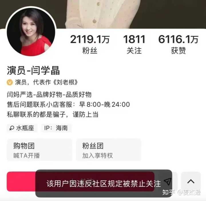 有大佬曾经告诉过我们,别人饿肚子的时候,如果我们有肉吃,那么我们吃肉的时候不在别人面前吧唧嘴,这也是一种善良。 但是著名演员闫学晶没明白这个道理,就是喜欢在别人饿肚子的时候说自己家的“燕窝”不好吃,所以最近,她就被推上了风口浪尖。 被推上风口浪尖这个事,对闫学晶而言应该只是小事,毕竟她是公众人物,被推上风口浪尖估计她都已经习惯了。对她而言,更大的事其实是——就在近日,闫学晶几个平台的自媒体账号,被禁止关注了: |