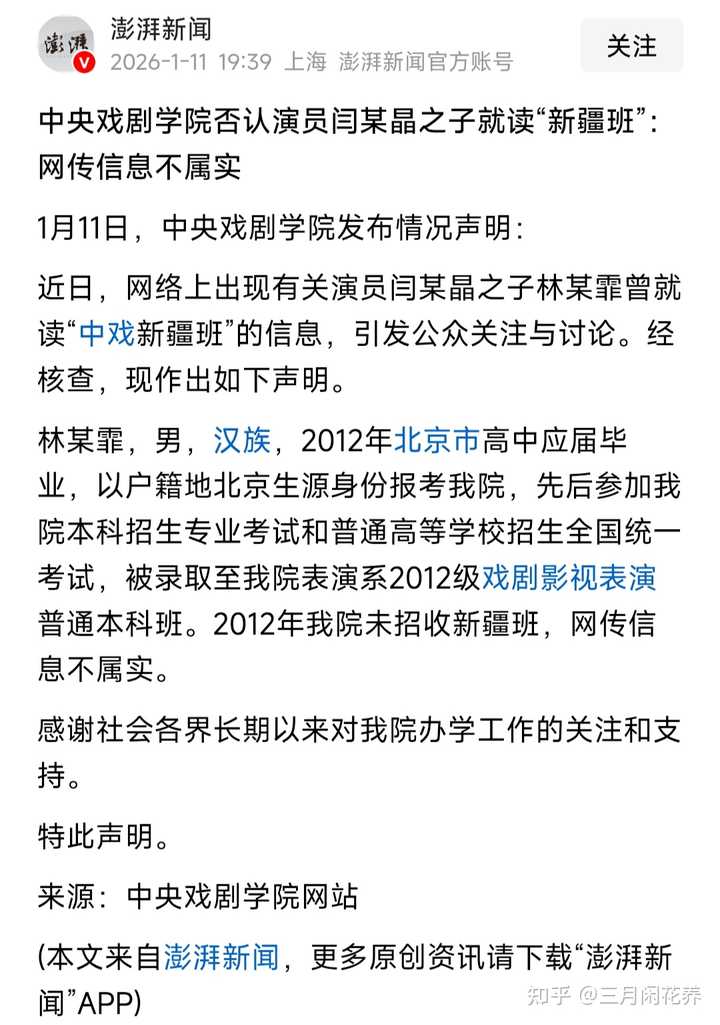 [教育信息]中央戏剧学院回应闫学晶儿子就读新疆班,称「不属实」,此前有博主实名举报其高考移民,如何看待? |