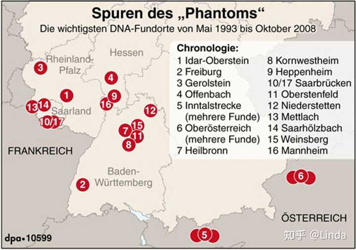 2007至2009年的时候,德国警察在德国南部、奥地利和法国搜捕一个东欧女人。因为她的DNA出现在2007年海尔布隆警察谋杀案现场,为了给死去的同事报仇,德国警察挖地三尺,也要找到这个身份不明的女人。媒体叫她海尔布隆幽灵。Heilbronner Phantom 海尔布隆警察谋杀案调查中,警察发现犯罪现场的DNA痕迹与1993年至2009年间的一系列其他犯罪行为存在关联。在其他40个犯罪现场也能找到这名女性的DNA。最匪夷所思的是,除了DNA之外,这些案件之间没有任何关联。追捕行动毫无结果。 犯罪现场: · 1993年5月25/26日,伊达尔-奥伯施泰因一名62岁女性被杀后,在一个杯子上发现了她的DNA(2001年进行DNA分析) · 2001年3月24日,弗莱堡一名61岁男性被杀后,在厨房抽屉上发现了她的DNA · 2001年10月,在盖罗尔施泰因一片林地中的一支海洛因注射器上发现了她的DNA · 2001年10月25日凌晨,布登海姆一辆被闯入的房车内,在一块饼干残渣上发现了她的DNA · 2004年,阿尔布瓦一起针对越南珠宝商的抢劫案后,在一把玩具手枪上发现了她的DNA · 2005年5月6日,沃尔姆斯两兄弟争吵后,在一颗子弹上发现了她的DNA · 2006年7月6日,奥地利毛特豪森一起电器店入室盗窃案中发现了她的DNA · 2006年10月3日,萨尔布吕肯布尔巴赫区一起住宅兼商用楼入室盗窃案后,在一块石头上发现了她的DNA · 2007年3月,加尔新基兴一起眼镜店入室盗窃案发现了她的DNA · 2007年7月7日凌晨,一群青少年闯入萨尔布吕肯一所学校后,在一个饮料罐上发现了她的DNA · 2003年至2007年间,黑森州、巴登-符腾堡州、蒂罗尔州、上奥地利州和萨尔兰发生的另外20起入室盗窃以及汽车和摩托车盗窃案现场发现了她的DNA · 2008年1月30日,在海彭海姆被杀害的三名格鲁吉亚人尸体所使用的运输车辆上发现了她的DNA · 2008年3月23日凌晨,尼德施泰滕一个废弃室内游泳池入室盗窃案现场发现了她的DNA · 2008年3月和4月,奎尔施、托莱和里奥尔发生的四起“居家抢劫”案现场发现了她的DNA · 2008年4月10日凌晨,奥伯斯滕费尔德-格罗瑙一起公寓入室盗窃案现场发现了她的DNA · 2008年5月9日晚,萨尔赫尔茨巴赫一个协会会所内一名女性遭袭击后,现场发现了她的DNA · 2008年10月7日,曼海姆两名男子争吵后,在一扇公寓门上发现了她的DNA · 2008年10月底,在温斯伯格被发现死亡的一名护理师的汽车中发现了她的DNA 2009年3月底,警察终于弄明白了,他们要找的女人不是一个犯罪团体的东欧女魔头。在所有犯罪现场提取的DNA都属于一名流水线女工的。这名东欧女工在棉签场工作,而且卷棉签的时候经常不戴手套,而常规的消毒不能销毁一些生产过程中留在上面的工人DNA。 |