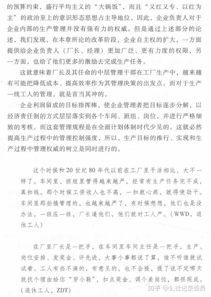 而文中提及的“干群之间的分化”,即便在国内其他研究中也是得以确认,比如《身份认同与生产政治:国企变迁中的劳动关系研究》中就提及 盛行平均主义的“大锅饭”,而且“又红又专、以红为主”的政治至上的意识形态思想占主导地位,因此,企业负责人对于企业内部的生产管理并没有强有力的权威。但是通过上述部分的论述,我们发现,在本章所论的改革阶段,企业自主权的扩大,一方面提供给企业负责人(厂长、经理)更加广泛、更有力度的权限,另一方面,也给了他们更多的激励去完成生产任务。 这就意味着厂长及其任命的中层管理干部在工厂生产中,越来越有可能把降低成本、提高效率作为其管理决策的出发点。而对于生产一线工人的管理,就是首当其冲的。 企业利润留成的目标指挥棒,使企业管理者把目标逐步分解,以经济责任制的方式层层落实到各个车间、班组、岗位,并进行严格细致的考核。而这套管理规程是在全面计划体制时代少见的。这就必然提高生产过程中的管理控制强度,所以,生产目标的推行、实现和生产过程中管理权威的树立是同时进行的。 这个时候和20世纪80年代以前在工厂里干活相比,大不一样了。车间里、班组里管得越来越严,经常有生产任务完不成,真扣钱。那个时候工资收入也不高,一扣就心疼,就得使劲干。车间里那些搞管理的,也越来越严了,有时候想想,他们也是没办法,一级压一级,厂长逼他们,他们就对工人严。(WWD,退休工人) 在厂里厂长是一把手,在车间里车间主任是一把手,生产、岗位安排、发奖金、评先进,大事小事都说了算,谁不听谁就试试看。工人有些不满的,有意见的,也不会提,提了说不定哪天就找个理由给你“穿小鞋”,扣点奖金、调个差岗位,都很现成。(退休工人,ZDT) |