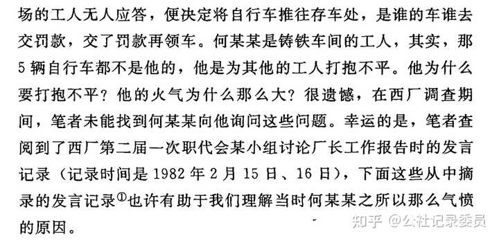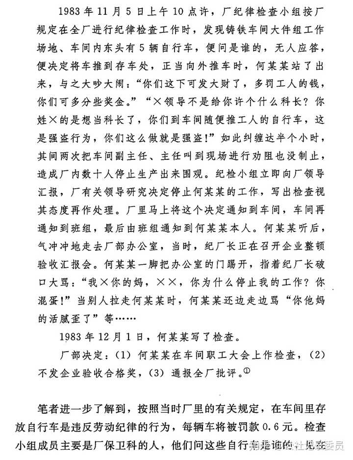 八十至九十年代是一个绝好的观察窗口,此时引领半个世纪的革命领袖已经逝世,革命的浪潮也被发展与现代化所取代,但新的风向尚未重塑整个社会,故而我们可以更好的观察革命的遗产。 在《西厂劳工》中记录了八十年代国企改革初期的一件事, 1983年11月5日上午10点许,厂纪律检查小组按厂规定在全厂进行纪律检查工作时,发现铸铁车间大件组工作场地、车间内东头有5辆自行车,便问是谁的,无人应答,便决定将车推到存车处,正当向外推车时,何某某站了出来,与之大吵大闹:“你们这下可发大财了,多罚工人的钱,你们可多分些奖金。”“×领导不是给你许个什么科长?你姓×的是想当科长了,你们到车间随便推工人的自行车,这是强盗行为,你们这么做就是强盗!”如此纠缠达半个小时,其间两次把车间副主任、主任叫到现场进行劝阻也没制止,造成厂内数十人停止生产出来围观。纪检小组立即向厂领导汇报,厂有关领导研究决定停止何某某的工作,写出检查视其态度再作处理。厂里马上将这个决定通知到车间,车间再通知到班组,最后由班组通知到何某某本人。何某某听后,气冲冲地走去厂部办公室,当时,纪厂长正在召开企业整顿验收汇报会。何某某一脚把办公室的门踢开,指着纪厂长破口大骂:“我×你的妈,××,你为什么停止我的工作?你混蛋!”当别人拉走何某某时,何某某还边走边骂“你他妈的活腻歪了”等··· |