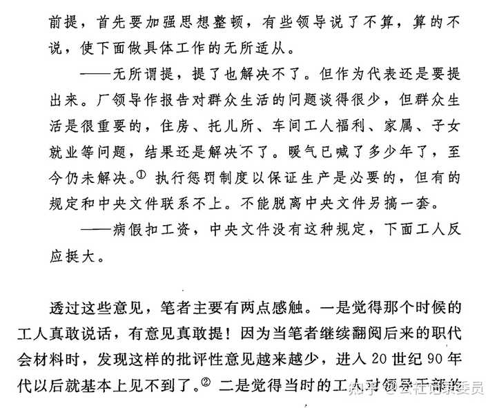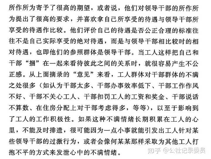 考虑到后续的篇幅,我们这里也节选一下 ——某某车间只有六七十名职工,却有四五个主任、书记,设备动力科居然有7个科长、副科长。提拔这么多干部,下面的工人能没有情绪?工人能口服心服吗? ——上面的干部能不能刷下来?究竟需要多少?交工人代表大会讨论一下。生产工人太少。正式的生产工人没有几个。不要谁有面子谁上去。尽是捣鼓上去的! ——干部多得没地方坐,鸡多不下蛋,还想发财,不就都吃了吗?这是不是浪费?厂长是难当,但是要怎么办?十个干部五个够不够用?要算一算,要调整嘛。 ——拿工资的人多,干活的人少。只有三分之一的人搞工时定额,出力的只有几百人,闲人太多!这好比比赛场,赛跑的运动员只有一个,发令员却那么多! ——职工多,干部也多,每个科室七八个干部。设备坏了扣工人,这没有道理,下面反映比较强烈。如果有生产任务不干,扣多少我都没意见。干部工作效率不高,相互扯皮,影响不好,群众有情绪。 ——科室都是为车间服务的,现在的科室,刚进厂的小年轻就上小白楼①,刚参加工作的小丫头便以电话命令车间去人拿本子,好像他们都是老爷,我们是什么?那么多干部为什么不送下来?作风太不像话了!上届提过,这届再提,看是否可以解决。 ——有一台液压剪床,受冷不能开。根据技术要求低于0度不能开。由于气温达不到,说坏就坏。那么大的车间两个炉子顶什么用?车间解决不了,我们自己到安技科去,林科长恶劣对待我们,太不像话! ——锻压车间夏天热,冬天冷,没有暖气,无棉袄,直接影响生产。厂里只是下达任务,但又不给创造条件。厂里搞了许多条文,都是在工人身上打主意。完不成扣工资,是土政策、土办法,不利于生产。在思想上并不愉快,思想上背了包袱。 ——铸钢车间排尘无人过问,工人干活受罪!厂里干部却不去体验一下。 ——科室坐着的,不流汗,不受累、不挨冻,也拿和工人一样多的奖金。 ——厂长采取扣罚工资,活越少越不好完成。有任务不干,罚是理所当然的。现在活不多,搞得月月完不成,月月扣工资。工人一年下来,奖金还不如干部!应该鼓励生产第一线的工人。 ——除了扣就是扣呀,拿了工人来开刀,反正就这两个钱,你就扣去吧!这是邪气! ——厂里提了那么多工程师,几乎没有技术员了。我们车间马某某,在农村好多年,回来才两年,就提拔为工程师。光有指挥员,没有战斗员怎么行? ——住房分配对干部考虑多,对工人考虑少。不应该只注意职务和关系,尤其要端正分房人的思想,最好让作风正派、思想端正的同志担任这一工作。 这些激烈的言辞是直接震撼到作者,以至于感慨道, 透过这些意见,笔者主要有两点感触。一是觉得那个时候的工人真敢说话,有意见真敢提!因为当笔者继续翻阅后来的职代会材料时,发现这样的批评性意见越来越少,进入20世纪90年代以后就基本上见不到了。②二是觉得当时的工人对领导干部的所作所为寄予了很高的期望,或者说,他们对领导干部的所作所为提出了很高的要求,并喜欢拿自己所享受的待遇与领导干部所享受的待遇作比较。他们评价自己的待遇是否公正合理的标准往往不是自己实际享受的绝对待遇,而是与领导干部相比较时的相对待遇,也即他们的参照群体是领导干部。当工人这样把自己和干部“捆”在一起来看待彼此之间的关系时,就很容易产生不公正感。从上面摘录的“意见”来看,工人群体对干部群体的不满之处很多(如认为干部太多、干部办事效率低下、干部工作作风不好、干部不关心工人、干部扣罚工人的工资和奖金、干部说话不算数、在住房分配上对干部考虑得多,等等),以至于影响到了工人的工作积极性。如果这种不满情绪长期积累在工人的心里,不能及时排遣,很可能因为一点小事就能引发出工人针对某些领导干部的过激行为,或者会像何某某那样采取为其他工人打抱不平的方式来发泄心中的不满情绪。 |
