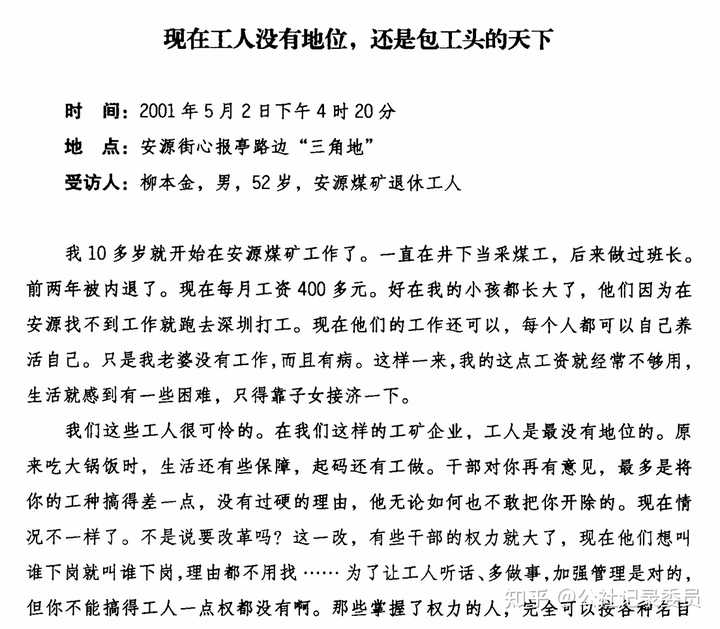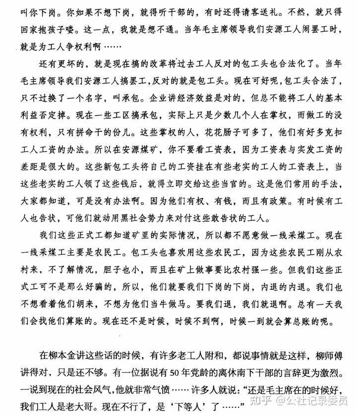 那这一切,现今何在? 于建嵘老爷子在他那本《安源实录:一个阶级的光荣与梦想》中有一篇采访 原来吃大锅饭时,生活还有些保障,起码还有工做。干部对你再有意见,最多是将你的工种搞得差一点,没有过硬的理由,他无论如何也不敢把你开除的。现在情况不一样了。不是说要改革吗?这一改,有些干部的权力就大了,现在他们想叫谁下岗就叫谁下岗,理由都不用找···为了让工人听话、多做事,加强管理是对的,但你不能搞得工人一点权都没有啊。那些掌握了权力的人,完全可以按各种名目叫你下岗。你如果不想下岗,就得听干部的,有时还得请客送礼。不然,就只得回家抱孩子喽。这一点,我就是想不通。当年毛子任领导我们安源工人闹罢工时,就是为工人争权利啊··· 还有更坏的,就是现在搞的改革将过去工人反对的包工头也合法化了。当年毛子任领导我们安源工人搞罢工,反对的就是包工头。现在可好呢,包工头合法了,只不过换了一个名字,叫承包。企业讲经济效益是对的,但总不能将工人的基本利益否定掉。现在一些工区搞承包,实际上只是少数几个人在掌权,而做工的没有权利,只有拼命干的份儿。这些掌权的人,花花肠子可多了,他们有好多克扣工人工资的办法。所以在安源煤矿,你不要看工资表,因为工资表与实发工资的差距是很大的。这些新包工头将自己的工资挂在有些老实的工人的工资表上,当这些老实的工人领了这些钱后,就得立即交给这些当官的。这是他们常用的手法,大家都知道,可是没有办法啊。因为他们有权、有钱,而且有政策。有时候有工人也告状,可他们就动用黑社会势力来对付这些敢告状的工人。 我们这些正式工都知道矿里的实际情况,所以都不愿意做一线采煤工。现在一线采煤工主要是农民工。包工头也喜欢用这些农民工,因为这些农民工刚从农村来,不了解情况,胆子也小,而且在矿上做事要比农村强一些。但我们这些正式工可不是那么好骗的,所以,他们就要我们下岗的下岗,内退的内退。我们也不想看着他们胡来,不想为他们当牛做马。要我们退,我们就退啊。总有一天我们会找他们算账的。现在还不是时候,时候不到啊,时候一到就会算总账的呢。 在柳本金讲这些话的时候,有许多老工人附和,都说事情就是这样,柳师傅讲得对,只是还不够。有一位据说有50年党龄的离休南下干部的言辞更为激烈。一说到现在的社会风气,他就非常气愤···许多人就说:“还是毛子任在的时候好,我们工人是老大哥。现在不行了,是‘下等人’了···” |