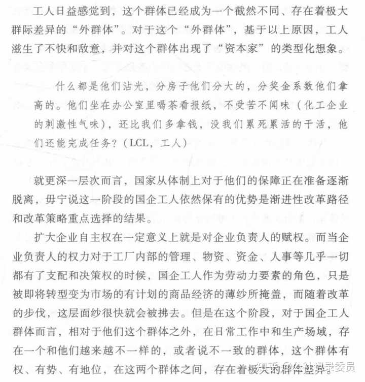 工人日益感觉到,这个群体已经成为一个截然不同、存在着极大群际差异的“外群体”。对于这个“外群体”,基于以上原因,工人滋生了不快和敌意,并对这个群体出现了“资本家”的类型化想象。 什么都是他们沾光,分房子他们分大的,分奖金系数他们拿高的。他们坐在办公室里喝茶看报纸,不受苦不闻味(化工企业的刺激性气味),还比我们多拿钱,没我们累死累活的干活,他们还能完成任务?(LCL,工人) |