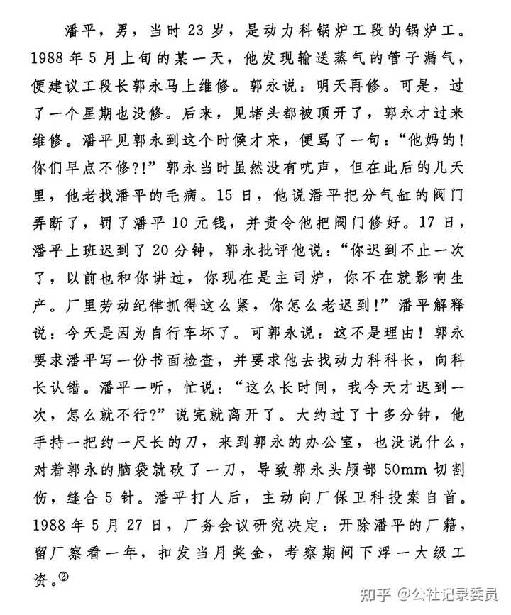 一个厂长负责制下企业的厂长,为了给自己涨两级工资(两级工资加在一起也就十多元),竟然需要如此兴师动众,而且表决了两次才获得通过。而且,第一次举手表决时,赞成者没有过半数;第二次表决时,仍然有四五个人没有举手。这种举手表决的方式不同于匿名投票,是公开的,有这么多人竟敢在厂长面前公开表示不同意给厂长涨工资,这在一定程度上反映了当时的职工群众对干群之间的收入差距的承受能力很低,也反映了当时的职工群众并不怎么怕厂长。这从另一个角度也反映出,尽管当时已经实行了厂长负责制,可职工群众并不怎么认同厂长的权威地位。 而这种发自内心的主人翁意识,和并不理睬RO掀起的新浪潮,在某些方面就尤为突出 潘平,男,当时 23 岁,是动力科锅炉工段的锅炉工。1988年5月上旬的某一天,他发现输送蒸气的管子漏气,便建议工段长郭永马上维修。郭永说:明天再修。可是,过了一个星期也没修。后来,见堵头都被顶开了,郭永才过来维修。潘平见郭永到这个时候才来,便骂了一句:“他妈的!你们早点不修?!”郭永当时虽然没有吭声,但在此后的几天里,他老找潘平的毛病。15日,他说潘平把分气缸的阀门弄断了,罚了潘平10元钱,并责令他把阀门修好。17日,潘平上班迟到了20分钟,郭永批评他说:“你迟到不止一次了,以前也和你讲过,你现在是主司炉,你不在就影响生产。厂里劳动纪律抓得这么紧,你怎么老迟到!”潘平解释说:今天是因为自行车坏了。可郭永说:这不是理由!郭永要求潘平写一份书面检查,并要求他去找动力科科长,向科长认错。潘平一听,忙说: “这么长时间,我今天才迟到一次,怎么就不行?”说完就离开了。大约过了十多分钟,他手持一把约一尺长的刀,来到郭永的办公室,也没说什么,对着郭永的脑袋就砍了一刀,导致郭永头颅部50mm切割伤,缝合5针。潘平打人后,主动向厂保卫科投案自首。1988年5月27日,厂务会议研究决定:开除潘平的厂籍,留厂察看一年,扣发当月奖金,考察期间下浮一大级工资。② |