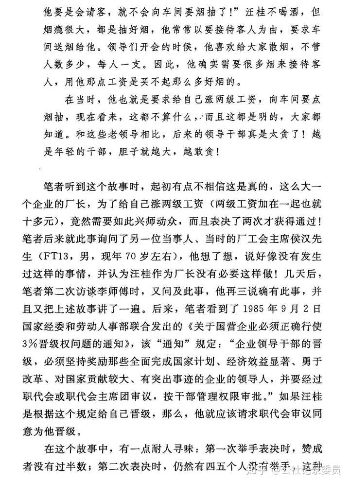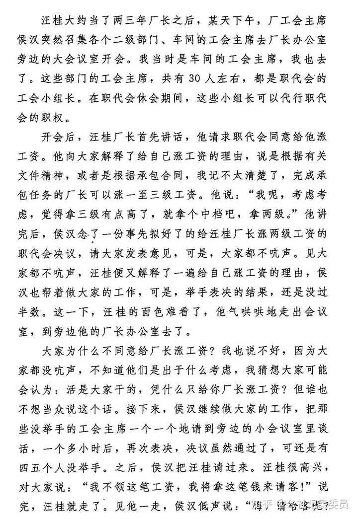 好了,说回《西厂劳工》,作者在感叹“一是觉得那个时候的工人真敢说话,有意见真敢提!因为当笔者继续翻阅后来的职代会材料时,发现这样的批评性意见越来越少,进入20世纪90年代以后就基本上见不到了。”本质仍是RO体制下厂长负责制尚未完全战胜劳工主权的反映, 我们以一个具体的事例来看, 汪桂大约当了两三年厂长之后,某天下午,厂工会主席侯汉突然召集各个二级部门、车间的工会主席去厂长办公室旁边的大会议室开会。我当时是车间的工会主席,我也去了。这些部门的工会主席,共有30人左右,都是职代会的工会小组长。在职代会休会期间,这些小组长可以代行职代会的职权。 开会后,汪桂厂长首先讲话,他请求职代会同意给他涨工资。他向大家解释了给自己涨工资的理由,说是根据有关文件精神,或者是根据承包合同,我记不太清楚了,完成承包任务的厂长可以涨一至三级工资。他说:“我呢,考虑考虑,觉得拿三级有点高了,就拿个中档吧,拿两级。”他讲完后,侯汉念了一份事先拟好了的给汪桂厂长涨两级工资的职代会决议,请大家发表意见,可是,大家都不吭声。见大家都不吭声,汪桂便又解释了一遍给自己涨工资的理由,侯汉也帮着做大家的工作,可是,举手表决的结果,还是没过半数。这一下,汪桂的面色难看了,他气哄哄地走出会议室,到旁边他的厂长办公室去了。 大家为什么不同意给厂长涨工资?我也说不好,因为大家都没吭声,不知道他们是出于什么考虑,我猜想大家可能会认为:活是大家干的,凭什么只给你厂长涨工资?但谁也不想当众说这个话。接下来,侯汉继续做大家的工作,把那些没举手的工会主席一个一个地请到旁边的小会议室里谈话,一个多小时后,再次表决,决议虽然通过了,可还是有四五个人没举手。之后,侯汉把汪桂请过来。汪桂很高兴,对大家说:“我不领这笔工资,我将拿这笔钱来请客!”说完,汪桂就走了。见他一走,侯汉低声说:“嗨,请啥客呢? 他要是会请客,就不会向车间要烟抽了!”汪桂不喝酒,但烟瘾很大,都是抽好烟,他常常以要接待客人为由,要求车间送烟给他。领导们开会的时候,他喜欢给大家散烟,不管人数多少,每人一支。因此,他确实需要很多烟来接待客人,用他那点工资是买不起那么多好烟的。 在当时,他也就是要求给自己涨两级工资,向车间要点烟抽,现在看来,这都不算什么,而且这都是明的,大家都知道。和这些老领导相比,后来的领导干部真是太贪了!越是年轻的干部,胆子就越大,越敢贪! |