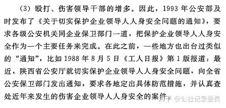 这种对抗在九十年代前后走向了高潮,成功迫使XX部要发布《关于切实保护企业领导人人身安全问题的通知》的事。 (3)殴打、伤害领导干部的增多。因此,1993年公安部及时发布了《关于切实保护企业领导人人身安全问题的通知》,要求各级公安机关同企业保卫部门一道,把保护企业领导人人身安全作为一个主要任务来完成。在此之前,一些地方也出台过类似的“通知”,比如1988年8月5日《工人日报》第1版报道:最近,陕西省公安厅就切实保护企业领导人人身安全问题,向全省公安保卫部门发出通知,要求各地定出具体防范措施,并认真查处近年来发生的伤害企业领导人人身安全的案件。 |