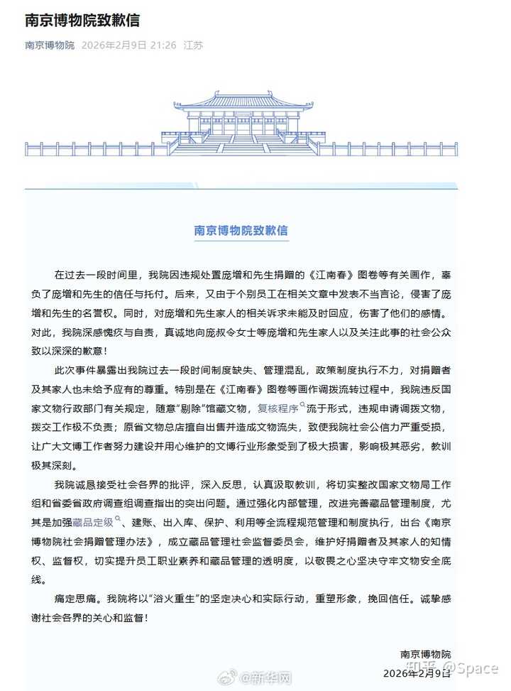 南京博物院2月9日发布致歉信。 在过去一段时间里,我院因违规处置庞增和先生捐赠的《江南春》图卷等有关画作,辜负了庞增和先生的信任与托付。后来,又由于个… |