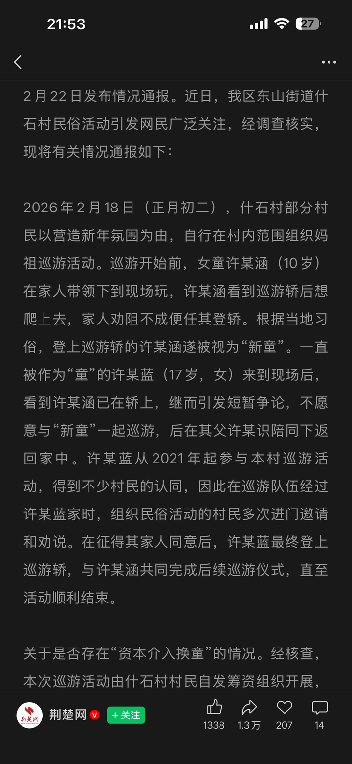 这么说就能说得通了,感谢这位 @momo 给我点了一下?????? 三更:为了以防歧义我说一下,我总结的这些都是从b站上面扒下来的三手信息,目的是让点进来的人明白大概是个什么情况然后一起吃瓜看乐子 从我目前看到的视频来看,属实的是:给许家的小孩弄上花轿,小孩在花轿上面没什么动作,小姑娘不在视频里的时候花轿没人抬,许家给这小姑娘强硬的请回来了,然后许家的小孩和那个小姑娘一起在花轿上被抬着走,小姑娘被抬的时候好像还在做法事?最后小姑娘臭着脸。剩下的是我从评论区里听说的没视频佐证的八卦,但是可以把有视频佐证的部分串起来,我就原模原样的搬上来,真假不好说,发出来给大家看个乐子就是了。 然后!我没说过任何这个许家和许家印有关系的话,我甚至到现在都不知道他家主事的姓甚名谁,别瞎往上面靠哈 附:刚才刷到小姑娘自己的视频了,她说自己被家里人保护的很好,家里人也没有受到威胁,公道自在人心,不愿意事情在网络上发酵 |
