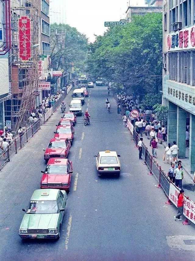 3、80年代广州市区的北京路,已经是极为繁华的所在了,街上可以看到很多的出租车,并且在道路上也已经设置了机非隔离栅。 |