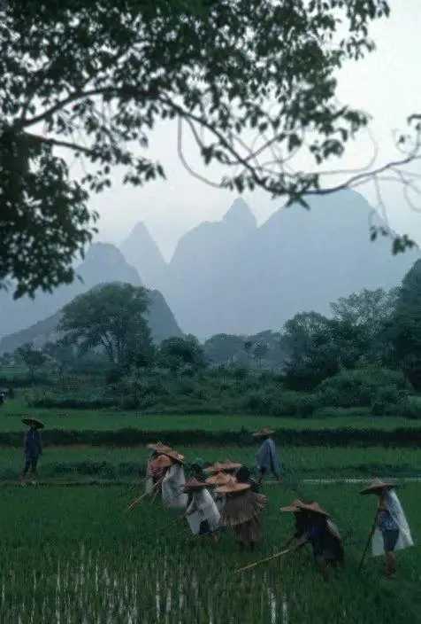 5、1981年的桂林,人们正在田间进行着劳作,此时天空正下着小雨,所有的人都带着斗笠和穿着雨衣,没有雨衣的则裹着塑料薄膜。 |