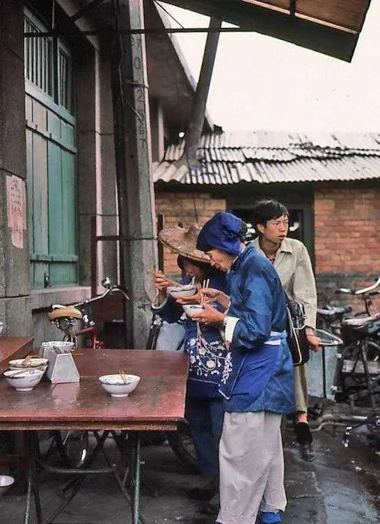 6、80年代的昆明,两名少数民族的老大娘正在一家卖米粉的摊位前吃着米饭,在那个时候好多的摊位都是不设置座椅的。 |