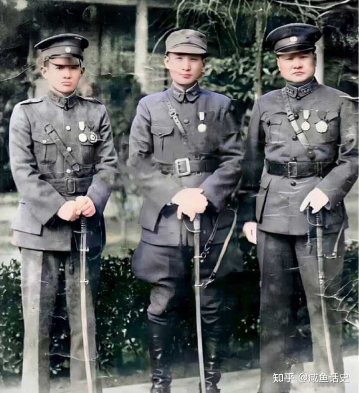 1932年,一二八淞沪抗战后,俞济时、张治中、戴戟授勋时候的照片,当时三人分别担任第5军88师师长、第5军军长和上海警备司令。 当时国军的军服仍未完全统一,其中俞济时和戴戟头戴大檐帽,而张治中则头戴圆筒帽,国军的军服沿用了北伐时期中山服的样式,但是因为有一段时间和德国深度合作,收到了德国军服的影响,就出现了由德国军事顾问设计的圆筒型布制小帽。 |