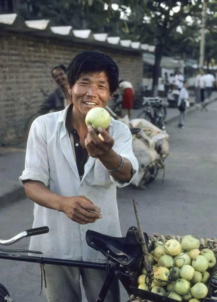 20、80年代的石家庄,一名男子正用自行车推着一筐苹果沿街叫卖,看到有人给他拍照时,从筐里拿出了一个苹果让摄影师品尝。 |