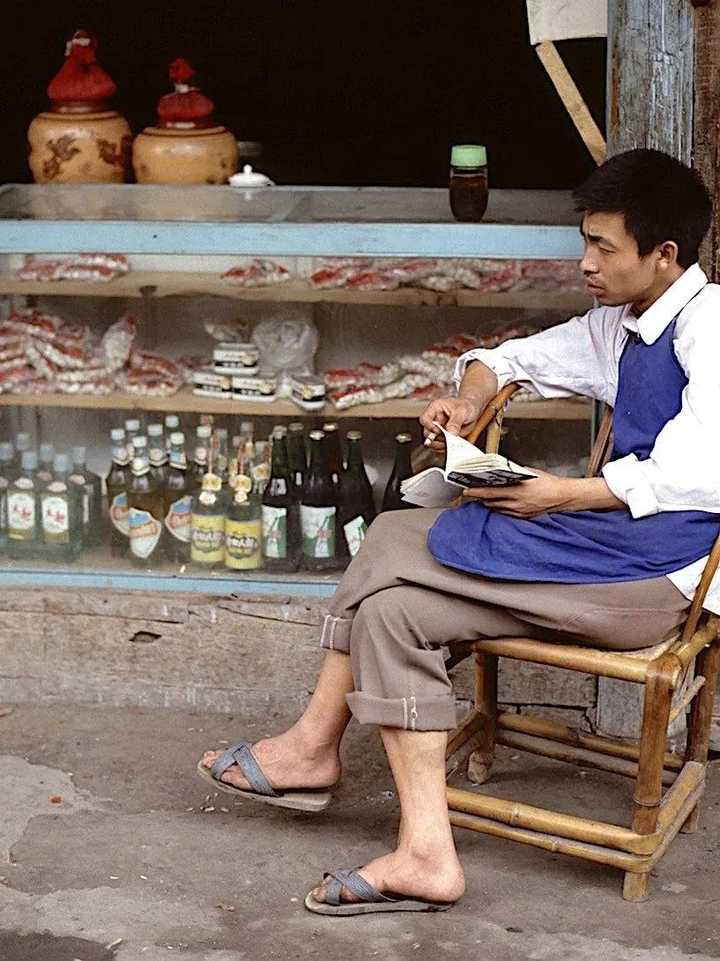 17、1985年都江堰,一间商店的老板正坐在门口的椅子上看着小人书,此时正是工作日的上班时间,所以来这里买商品的顾客并不多。 |