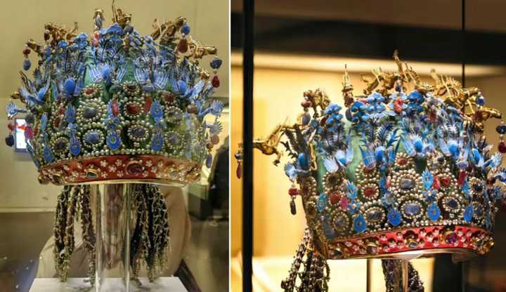 点翠嵌珠石金龙凤冠(明万历) 1393年,明朝皇室服饰和头饰等级制度制定后,平民便被禁止再使用蓝色和明黄色。 |