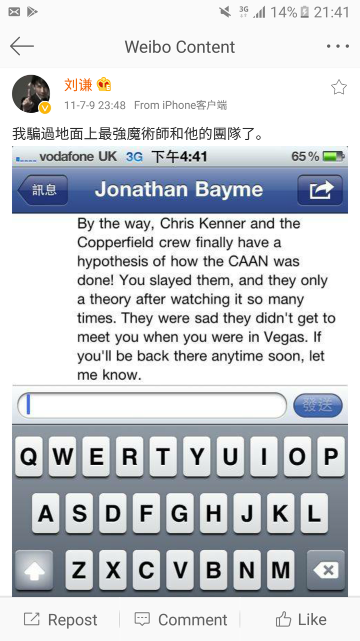 在国际业界的金字塔顶端, 它是被当作,一门复杂缜密的学问来研究的。 它从来都是一种,高雅的剧场艺术。 只是,魔术的技术门槛很高, 所需要learning curve实在长, 所以,能把它真正表演成艺术的人,甚少。 郑重声明,这一趴,我真的没有,粉丝滤镜。233333 刘谦,从2009年至今, 在国际业界绝对可以算是开疆辟土,高歌凯旋。 虽然,大众都不知道,也不care。。。 2011年,他没上春晚, 在高强度地当了两年当红艺人之后, 他又当回了魔术师。 2011年, A 他以第一位华人魔术师的身份, 在拉斯维加斯,Wynn的舞台上, 举办了两场,两个小时的个人售票专场演出。 他是第一个在那儿, 以个人名义撑起一场秀的东方人。 大卫科波菲尔,在隔条街的 MGM Grand 的舞台上, 和他做着一样的事。 演出完,全场起立鼓掌。 结束后,后台聚集了很多美国的同行们。 |