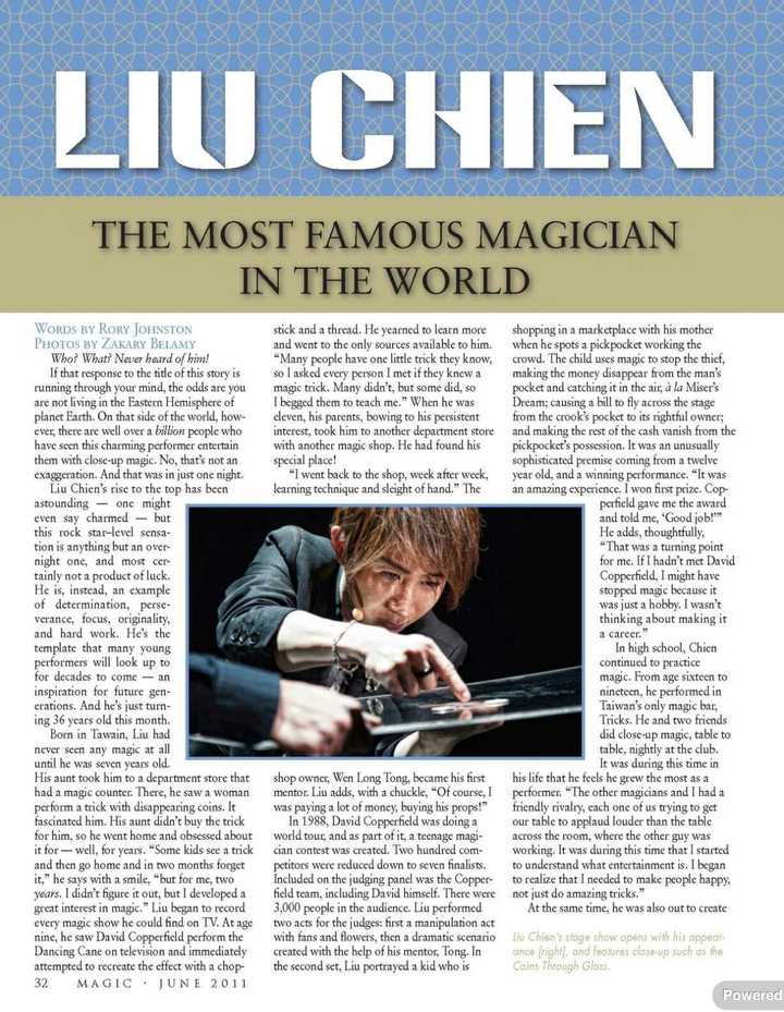 01:31 EMC 2011 宣传片 C 他以第一位华人魔术师的身份, 登上了《Magic》杂志的封面。 敢叫,《魔术》的魔术杂志,可不是闹着玩的。。。 这是全球发行量最大,最权威的专业刊物。 它以,“全世界最著名的魔术师” 为题, 对他进行了长达8页的报道。 “他,的确是,象征着, 决心,坚韧,专注,创新和勤勉的榜样。 他会是未来,十几年,甚至几十年间, 年轻表演者仰望的楷模。” ——《魔术》 |