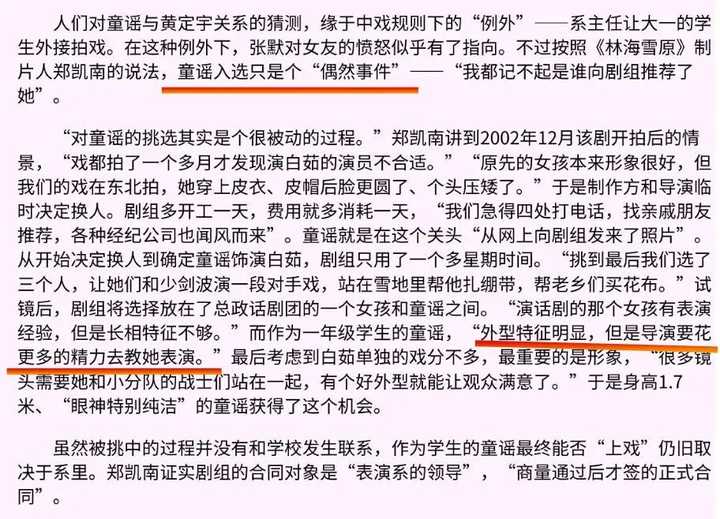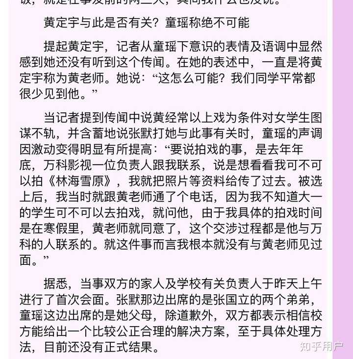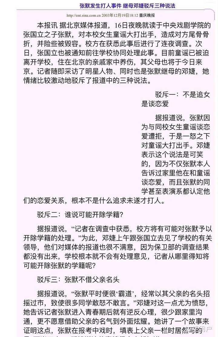 ?在这57份参考资料中,媒体报道的已知事实是:暴力事件本身、双方的说法、学校的处理决定。 其他的说法,尤其是童瑶“出轨”与“翻供”一说,在当时是没有任何官方(如司法与校方)结论或权威媒体的调查报道能够证实这一点。 反而,当时的报道是这样的。 张国立父子俩一直对方声称实施暴力是另有隐情,明里暗里说童瑶跟别人有染,紧接着就有知情人出来爆料,说童瑶为了拿到《林海雪原》资源跟系主任黄定宇有一腿。 可当媒体联系到《林海雪原》制片人郑凯南时,郑凯南的说法完全跟这位“知情人”的说法不同。 |