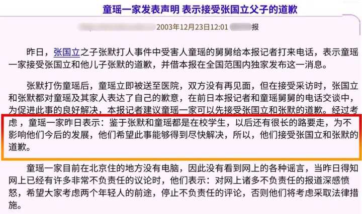 所以也不知道为什么到如今,22年过去了,被打的童瑶反倒成“反派”了,有一点莫名其妙。 PS:“翻供”一说在哪个权威媒体看到的,求引路,我也要吃瓜! 其实,稍微去考古一下就会发现。 被打后,童瑶方的态度一直都是不想把事情闹大,并接受张国立父子的道歉。 |