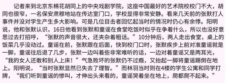 不过,当我点开这些网页后发现,这些权威媒体的报道,都未曾说过童瑶“翻供”的事情。 关于事件核心与公开事实,当时媒体都是这样写的:张默,在校内对女友童瑶实施暴力殴打,导致童瑶身体多处受伤。 |