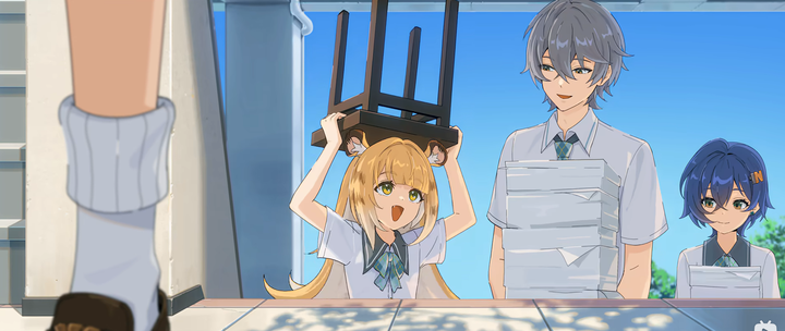 然后就开始跑 这段挺搞的,因为一开始妹妹是坐在靠窗里面那一侧,结果最后妹妹跑在前面。 有理由相信玲是对课桌做了个跳山羊出去的。 出门后倒是哲哥在前了。 |