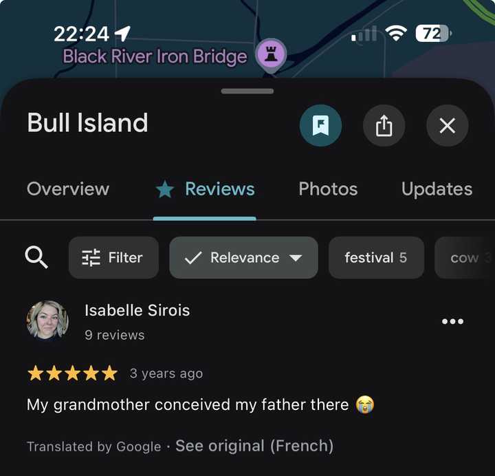 谷歌地图公牛岛有一条评论特别应景“我奶奶是在那里怀上的我爸” |