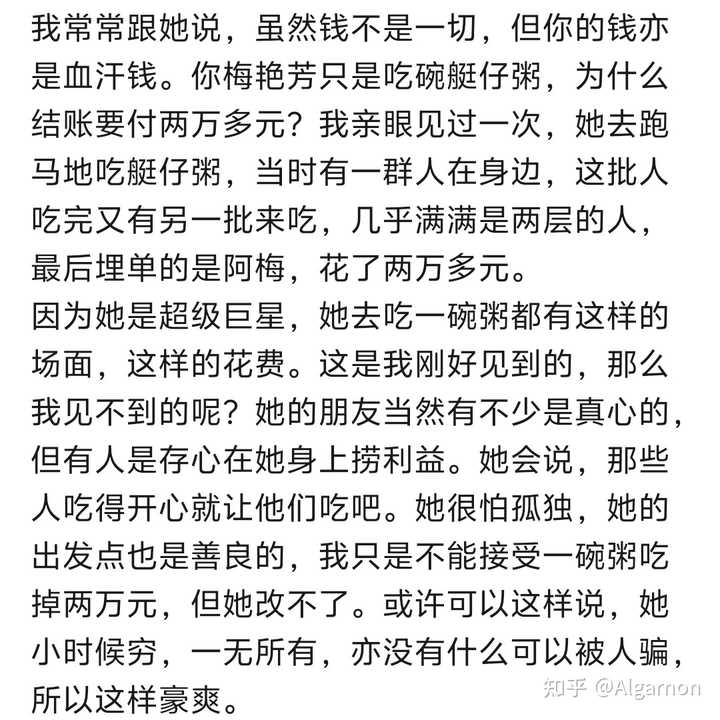 梅艳芳鼓励粉丝读书 她和粉丝同坐电梯,总是替他人关门的那个,同进入礼堂,先开门给粉丝。 一个女粉聚会被男生碰到,立即关心有没有被男生占到便宜。说:女孩子是不能让男孩子欺负的! 一个粉丝高考考砸,心灰意冷想直接工作,她苦口婆心劝粉丝一定要读大学,改变了粉丝的人生。 女粉丝探班后已经好晚,她让粉丝先睡自己家,并给她们听还未发行的专辑 一个粉丝参加工作后不再常来看她,以为会被忘掉,结果却在大街上被梅艳芳拍肩叙旧。 天冷了,她提醒粉丝多穿衣服,粉丝故意气她拌嘴,结果居然被粉丝说的默默哭,吓得粉丝赶紧安慰。 一个粉丝要出国读大学了,想到要离家好几年很难过,抱着梅姐大哭,结果梅艳芳居然也心疼落泪,说你长大了要学会自己照顾自己呀,你这样我真不放心。 一个女粉丝在梅艳芳退出舞台的最后一场演唱会后跟梅艳芳在家门口拥抱谈了半个多小时,梅艳芳当时的男朋友傻傻站在旁边,被惊呆了。 一个与梅艳芳素未谋面的粉丝意外去世,梅艳芳要了他的照片,回家给他念经 她在拍戏时病倒,去隔间修整,却还反过来安慰粉丝,说吃些药就好了。 粉丝去探班,在化妆间外等待,她发现后坚持让其进屋,担心粉丝冷,又将自己身上的羽绒服脱下来披在了粉丝的身上。 粉丝因皮肤染病被同事嫌弃,难过的问她你怕我吗,她摸了摸她的手,摸了摸她的脸,说,不害怕。 在梅艳芳病重,最后一次露面时,明明已经嘴唇发白,气若游丝,却还是敏锐的看出一个粉丝的低落,用尽力气关心到:你不开心吗? 。。。太多太多事了。。。 粉丝给梅艳芳写的信,买的礼物,梅艳芳从来没有扔过,她特地腾出空屋子装粉丝的礼物和信。在她去世后,恒安阁的旧居第一次被开启,屋里堆的,都是粉丝送的玩偶。她后来曾说,她觉得她与粉丝的爱,是比其他爱还要伟大的,是男女之情比不上的。其实在她的所有感情经历中,她付出最多的,其实是粉丝。我衷心觉得,当她的粉丝真的是是很幸福的一件事。 |