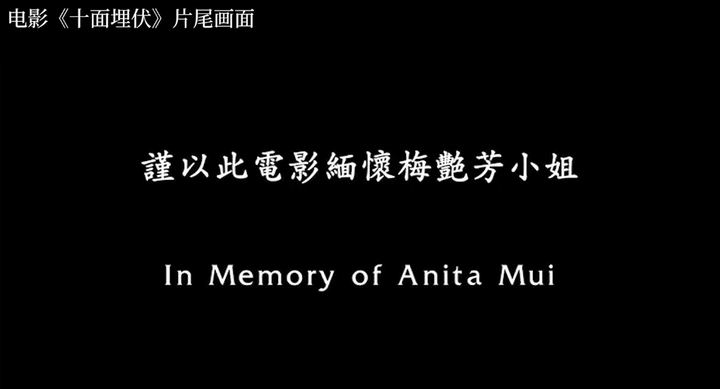 梅艳芳终究还是带着遗憾走了,而这件事也成了压在江志强心上的一块石头。 他觉得自己 永远欠了梅艳芳一部电影。 《十面埋伏》是在梅艳芳去世半年以后才上映的,为了纪念梅艳芳,张艺谋和江志强一致决定,在片尾增加了一行字幕: 谨以此电影缅怀梅艳芳小姐 起初观众不明白这部电影和梅艳芳有什么关系,得知真相后,很多人都破防了。 |