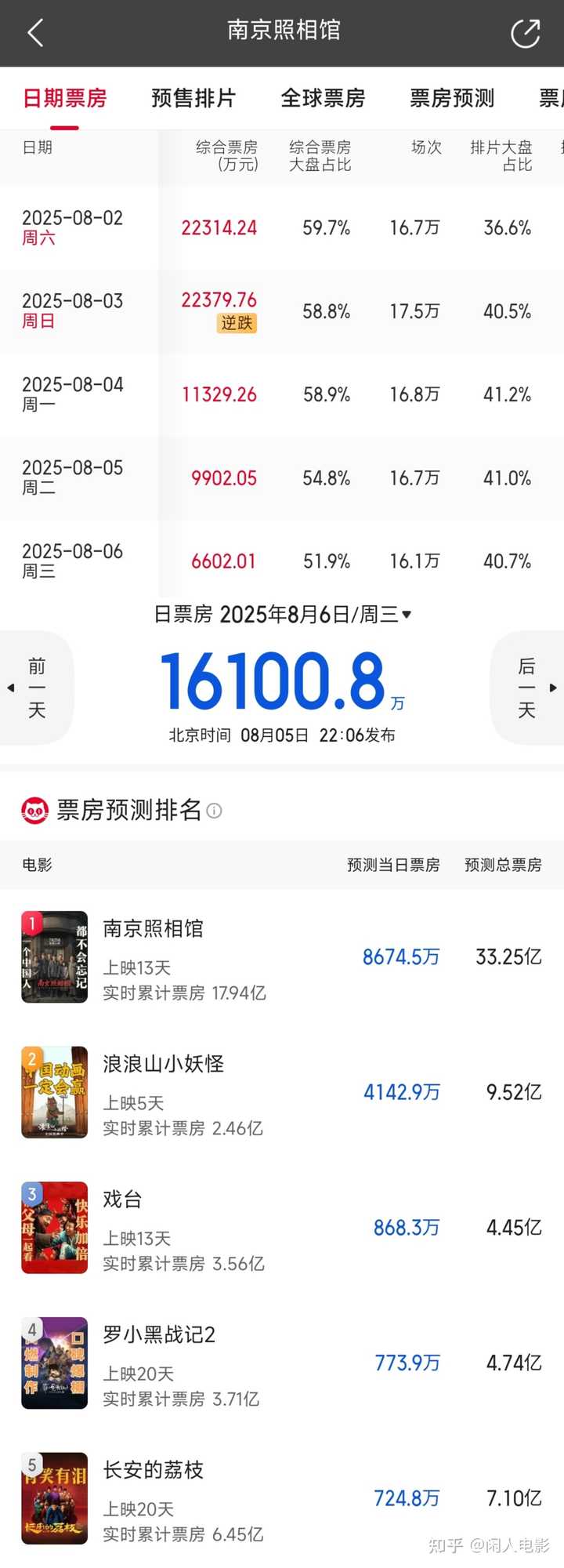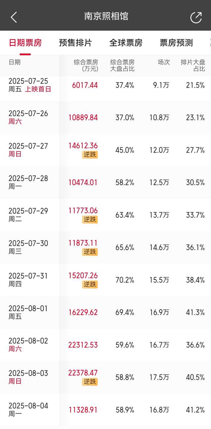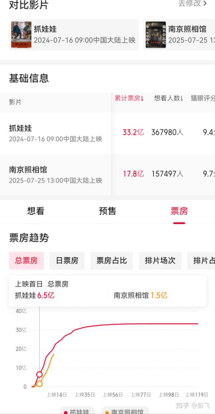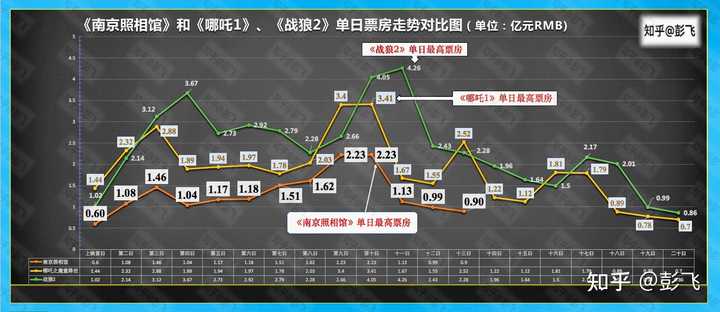 早在 7 月份的回答中我就说过: 预测这事儿你要辩证的看,好不容易出来一部良心制作,千万别被不靠谱的预测给“奶死”了。 毕竟这是机构宣称用 AI 预测的,无论是猫眼还是灯塔,错了,它都不用负任何责任。 更何况,这玩意儿可以随意调整,如果预测低了呢,它就不断地调高,而预测高了呢,它就一次次调低。 比如今年春节的《哪吒之魔童闹海》,两平台的预测一路水涨船高,当最终预测到 150 亿的时候,AI 也畏惧了,感觉预测的可能太高了,又开始不断往回调。结果众所周知,《哪吒之魔童闹海》最终仅在国内就拿下了 154.46 亿票房,还好没被“奶死”。 电影《南京照相馆》与《哪吒 2》完全不一样,后者属于纯粹的爽片。 但这部「南京大屠杀」题材的电影《南京照相馆》,它不是娱乐爽片,它甚至也不是《拯救大兵瑞恩》那样的战争片,因为里面战争场面极少。 所以,它能达到多少票房,其实取决于我们身边有多少人,想让世界知道中国在二战中的牺牲究竟有多大。 看我制作的下图,与《南京照相馆》同样在暑期档(7 月底)上映的电影《哪吒 1》和《战狼 2》的票房走势曲线,可谓是全面碾压《南京照相馆》。 ? 《战狼 2》单日最高票房出现在次周末,单日 4.26 亿。 ? 《哪吒 1》单日最高票房同样出现在次周末,单日 3.41 亿。 ? 《南京照相馆》最高单日票房,目前也出现在次周末,是上周日的 2.23 亿。 由此可见,他们仨,就根本不是一个量级的选手。 |