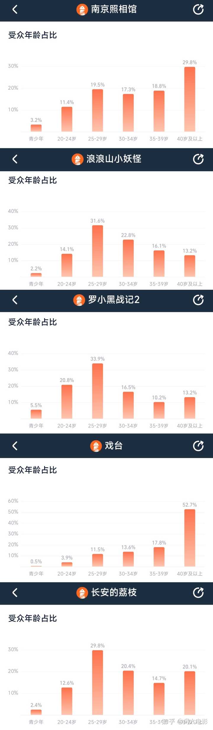如《南京照相馆》算是覆盖了全年龄段,但因题材比较沉重,很少有人二刷三刷,不像《哪吒2》,这样一来,纯靠新观众,其实票房涨势并不强,到了一定阶段就会放缓。 《浪浪山小妖怪》也起势了,跟《罗小黑战记2》一样,比较合家欢,30岁以下的观众的首选;《戏台》是40岁以上老年人市场的王者,《长安的荔枝》牢牢霸占中年人市场,《南京照相馆》双拳难敌四手。 |