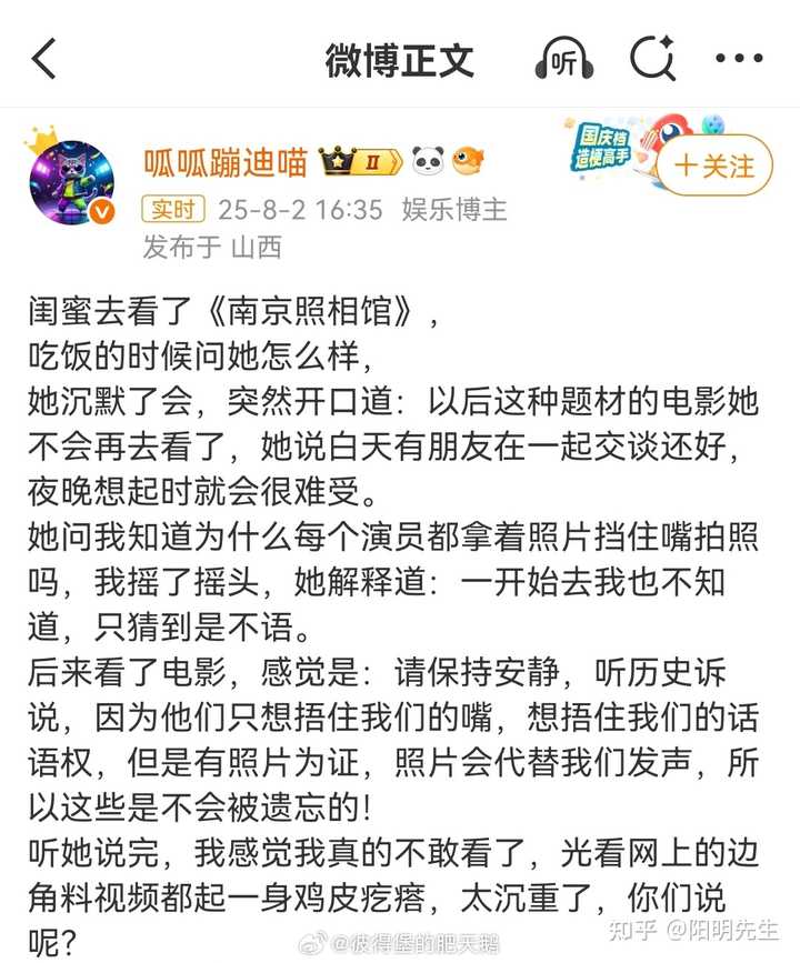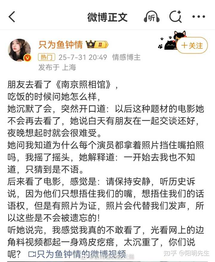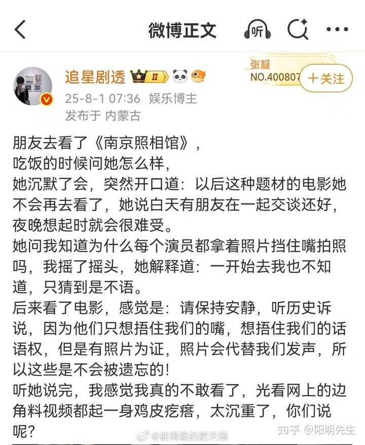 一来,非特效大片,挺正常的。 比如流浪地球我必看100多一张的IMax,但南京照相馆我看的就是40多一张的。 支持肯定是支持的,但大家钱也不是风刮来的。剧情片看一般的院线即可,工业特效大片必须上顶配。 其实,如果不是这个特殊题材我一定要帮帮场子、用钱投票,很多不错的剧情片可能我连院线都不去,而是会等流媒体。 二来,题材原因,n刷的会少很多。 流浪地球我4刷,哪吒二我3刷,但南京照相馆我大概不会再多刷。 片子我是毫不吝啬夸奖,但看完心情太沉重了。 即使是写这个回答时,一提到“南京照相馆”这个片名,我脑海中都是那血红的河湾、被摔死的婴儿,以及过去我读过的书、看过的纪录片,又愤怒又痛苦的复杂情绪就会上头。 就像张纯如关于南京大屠杀说,做好心理准备再看——毕竟真相太过于残酷。 内心铭记、但不忍多视。 我猜上两个原因,导致南京照相馆的票房可能不会很夸张。 送礼物 还没有人送礼物,鼓励一下作者吧 |
