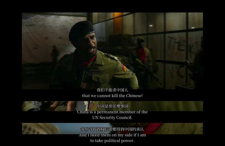 但我只看情节,这段并不突兀啊,之前就铺垫了——叛军首领说过他们就是为了政变夺权,叛军稳定局势后还要联合国五常认可的,所以不愿意招惹五常之一的中国,情节逻辑上很合理,尤其是大结局中国军队这边已经下令可以反击的情况下,交战双方都不愿意招惹中国也很正常啊 (这段叛军首领的意思应该是不能跟雇佣兵头子一样那么大张旗鼓地专门去屠杀中国公民,实际上他的叛军在之前跟政府军的武装冲突中也波及了不少中国人) |