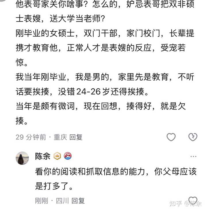 我年轻时也差一点嫁给一个“小张主任”。前男友身高184,家里全部在体制内,叔叔更是身居要职,经常在电视上露脸讲话。那时我还在上学,有一个这样的男友确实很拿得出手。 剧中没提,而在现实中,能在小城的机关里混得风生水起的的年轻人,一定是家里有背景的,也就是现在很热的那个称呼——县城婆罗门。 在小城市,这些人生活得非常舒适。他们几乎垄断了小城所有的优质资源——看病可以找人不用排队,孩子能上最好的市直幼儿园,家里的关系能给自己和配偶安排体面而轻松的工作,就连开车被交警拦,都能一个电话打过去就摆平。 然而我为什么选择和他分手呢?因为和这种家庭打交道,要支付一个代价——自由意志被剥夺。 王漫妮和小张主任的相处让我有种似曾相识的感觉。这个男人不可谓不真心,我也相信结婚后他会是一个好丈夫,好爸爸。但是,王漫妮所有的个人意志,大到人生安排,小到一张电影票,在小张主任那里都被否定,被压制。 和他在一起很好,但必须跟着他的节奏走。你无法走出自己的天地。 我决定分手是去前男友表哥家做客。彼时他表哥刚结婚,表嫂很漂亮,是一个双非的硕士研究生,被安排在我们那里的一所大学当老师。 那天满屋子的人,表哥父母一遍遍地让表嫂干这干那,表嫂低眉顺目又勤快麻利。期间,前男友的叔叔几次教育表嫂,表嫂一边站着,一边点头称是。 我至今都无法给出答案,一份体面的工作,一个富足安逸的生活,和在自己的一亩三分地说了算,活得痛快,这两点究竟哪个更重要。 那天我同前男友讨论过,这样一家子支使人家女孩子真的不好。他说一个不入流的硕士给她弄进大学当老师她还想说了算?还说我矫情,想太多。 但20岁的我,做不到低眉顺目地给一群没养育过我的人端茶倒水,站着听他们说教。我还那样年轻,还没真正感受过这个世界,人生就被安排得明明白白,再无其它可能。 虽然周围人都说这个机缘已经是很大的福气了,我仍然难以接受。 分手的时候前男友的眼泪和痛苦也曾让我迷茫过。我是有过彷徨的,是不是我真的很作,亲手毁掉了唾手可得的幸福。但身处其中,我的痛苦又是那样真实。 直到很多年后,在知乎,我遇见了INTP群体,才知道原来我并不是个例,才知道,原来真的有一个群体,把个人意志看得比生命更重要。 所以王漫妮的分手是必然的。虽然她虚荣,不切实际,但她是一个非常尊重自己个人意志的人。一个自我非常强的人,是不能在小城婆罗门这个群体里生存的。 分手后前男友消沉了一段时间,很快找到了漂亮又温柔的新女朋友。我也在分手的第二周,就收到了我老同桌的邀请,让我去和同学们出去烧烤散散心。 现在想来,这个躲在暗处惦记我很久的心机boy,哼。 后来成了我老公。 我们刚恋爱的时候,成都这个城市因为512大地震而元气大伤。房地产一度走到崩溃的边缘,房价甚至还不如我们这个四线小城市。 我老公的朋友在成都高新减灾研究所工作。他说自512之后,成都就着手开始了地震预警系统的建立。政府的决心非常强,哪怕天灾无常,也要用十分努力去挽救生命于万一。 我们屁民是接触不到高阶信息的。但每根城市的毛细血管,细细观察,脉搏都是和心脏同频的。 一个雄踞西南的大城市,一个想要有所作为的政府班子,不会因为一次天灾而持续消沉。哪怕彼时很多人对它并没有那么大的信心。 这就是最好的入场机会。别人都选择离场抛售,我们来抄底,趁人少,进场占据优势生态位。待这个巨人再次站起来,我们也能水涨船高,从小镇青年变成城市中产。 于是我详细和老公说起了我这个迁居计划,并承诺售后——万一混不明白灰溜溜地回老家,我负责和所有冷嘲热讽的亲朋好友撕逼。 老公痛快地答应了,他说他相信我的洞察和分析。于是这个男人抛下在小城优渥体面的工作和生活,随我远赴了西南。 在自己生活里充分行使自由意志,还被另一半理解支持,这种感觉太棒了。 我好爱他。 很多年后,前男友依然会夹杂着恨意和不甘来问我当初为什么抛弃他。我说我不能容忍自己的自我意志被剥夺。我今天的生活也许在你的评价体系里算不了什么,但我生命里的每一章,都是由我自己来执笔,我很满足。 他冷笑道:“别给我扯那些有的没的,你就是变心看上他(我老公)了。” 人是很难互相体谅的。我走过的心路,经历的挣扎,你并不需要了解。如果这样想我能让你心里好过些,那就当作是我最后的歉意吧。 无意冒犯,我就是惊叹,流量让我认识到了自己的狭隘,我就是个井底之蛙,何德何能一个晚上就结识了卧龙与凤雏。 |