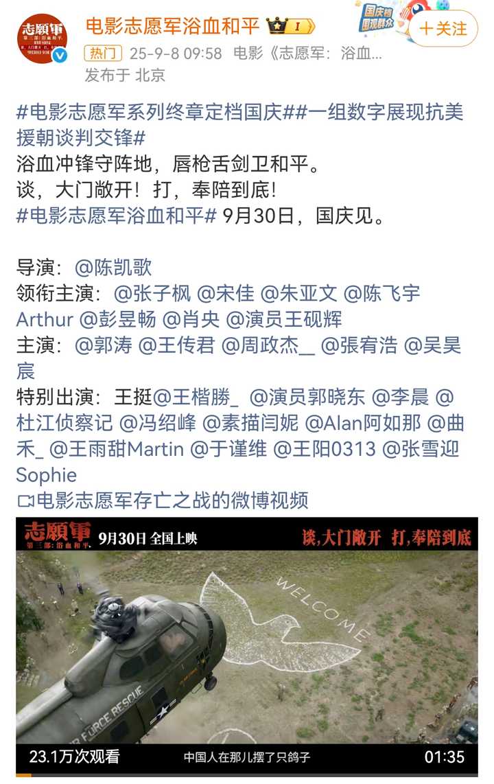 [影视娱乐]陈凯歌执导《志愿军 3:浴血和平》定档 9 月 30 日国庆档上映,对于这部电影你有哪些期待? |