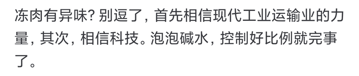 冻肉的味道不光看什么运输业。更何况那运输业也实在是不值一提。 上面说冻肉有味,味来自哪里呢? 一部分来自工业胶水。你可能要问工业胶拿来干嘛用。工业胶用来脱毛梗。少部分大厂,比如新希望六合,毛脱不完就是因为用的脱毛产品粘性不够。 一部分来自运输储存。所谓现代工业运输就是几十斤打个编织袋。 高端点的就是塑封后套个纸箱。运送全是靠普通货车,拉回仓库靠的是大风扇冷库。吹两年如果塑封不好吹的跟木乃伊一样,临期产品泡出来的水闻一下就吐了这就是日常。 做啥梦呢让你觉得都走冷链?是看蜀海(海底捞自营供应链)的车看多了吗? 最惊悚的应该是加工。工厂我没去过,但是我买的便宜货有福尔马林味。盲猜是分割车间没有冷气,为了防止没出厂就臭了直接丢福尔马林里。 然而这都不是亮点,亮点是我洗货的时候还在干呕,卤货就忍不住开吃了。 根本吃不出异味。 至于截图那位,这打眼一看连批发市场冻货大库都没进过的人还侃侃而谈呢? 送礼物 还没有人送礼物,鼓励一下作者吧 |