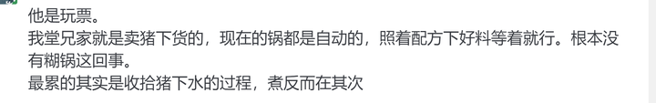 哥们,玩票说的是不用这个吃饭,不是外行。 至于他提的卖下水,我也不知道为什么要来掺和卤肉这一摊子,哥们你那是下水,你和我这个完全就是两回事。哥们卤下水那玩意和卤猪脚饭一样,都是买的现成卤汁没有火候变化有啥难的吗? 既然都觉得我糊锅是菜,我把全套的工艺贴给你,让你知道为什么他会糊。顺便你看了也就知道了,普通人拿到配方没啥用,还得有人教。 ===================================== 首先要准备高汤,鸡的,来十斤。另外十斤拿这个练出十斤。 水,25斤,软不软都行,金锣高汤膏60克,白酒30克40度以上的,鸡架2个,猪骨2斤,猪皮两斤,姜一两,小葱一两,大葱去黄叶的二两,八角10克,花椒5克,小茴香10克,陈皮10克, 这样有了20斤汤。如果不愿意练,可以直接用20斤鸡汤,会费后面的鸡架。 或者你有20斤卤鸡的卤子更好,市价大约五百到一千,问题是你玩坏了成本高一些。 20斤汤有了以后。 准备配料,第一包(20斤用量),辣椒20克福建辣椒王,20克印度魔鬼辣。 花椒30克,一半红的一半绿的,盐,140克, 350克东北砂糖,350克广西棉糖。 广西的可以多,东北的不能多,东北多了发黑。五香粉20克。 爱吃辣椒的自己调试辣度。 第二包(20斤用量),鸡精160克, 味精140, 白胡椒,注意必须是纯白胡椒粉20克,纯麦芽糖液300克,焦香型麦芽酚20克。 烧酒一桶。 草药类。(20斤用量) 甘草段9克,木香3克,新香叶9克, 白扣15克,陈香菜籽20克, 陈荜茇6克, 陈枝子4克, 新良姜9克(段) 陈白芷18克, 陈槟榔(不能带碎,不能带粉)20克, 陈草果6克, 陈山奈8克, 半年以上的陈小茴香12克,买不到软水泡半小时。 半年陈香砂仁25克,要大的,没有同上, 八角(指八个角整齐的)12,八角碎12, 老姜30,陈草寇10,新白胡椒19,积壳19去虫子,当归5克,玉果大,9克 陈千里香10,这个保险起见泡水一小时,或者有老卤后直接不放。 开卤。 你买鸡架,成袋子的,泡水半天,把血水倒掉,用自来水冲干净,晾干。 卤制 开小火,把草药丢进去,煮半小时, 因为你卤制的全是鸡架,你就把鸡架全放进去就好了,但是鸡架放不了多少,一个桶也就10来个,这玩意占地方,高手可以在鸡架上压篦子,篦子上加水盆,把鸡架压进去,新手不要尝试,这就是为什么我们用直上直下的白钢桶,而外行用铁锅的关系。 你算好鸡架重量后,按照比例量第一包的量。 鸡架下去水开了后,开大火,倒第一包, 等料粉走一圈(随着水头翻滚一圈充分溶解)以后,泼酒,关小火,打沫子。 时间是17+15+10 ,等这个时效跑完以后,开大火,倒第二包,走一圈,泼酒,关小火,打沫子,小火五分钟,焖五分钟。 然后长筷子夹出来,打掉腔子里的中药,拿一个盆装着。 一包草药卤三次,走上卤肉不归路后,三天要卤一次,严禁无肉空烧,不然卤子就不能用了。 卤到鸡架有甜辣香味就可以开始卤别的。 顺提,卤汁会越来越多,按照自己能力来,为啥按照自己能力来呢,因为你手法不熟练卤汁少了糊锅。 但是一定要上秤。确保每次都是一样的。 我个人总结的17斤卤,3斤油,卤20斤货口味最好。 对的油要完全打出去称重量。 练吧,就这一步,评论区就得全军覆没。 ======================================== 鉴于下沉的厉害, 我讲清楚糊在哪。 三个开关要行云流水的开大到一个档位, 不然就会糊。 除此之外它(炉子上这一套)自己高兴了偶尔也会糊。 当然这玩意完全不糊也没有焦香味, 所以你综合把握。 小来小去的小糊可以不刷桶。 |