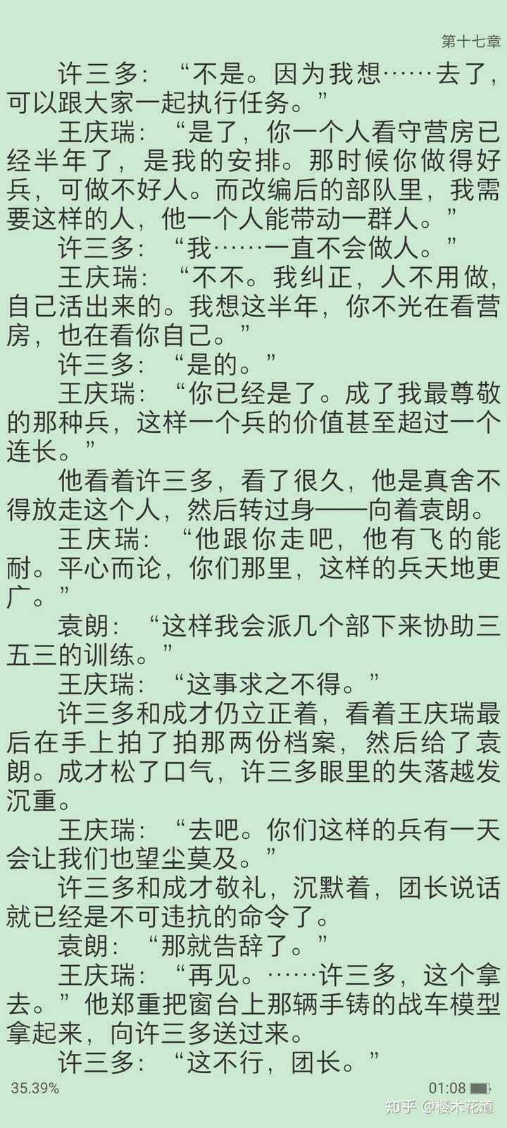 他第一次学会了自己去争取,大声说出自己要的是什么。 许三多终于知道了自己要走的路,知道了兵部是最适合自己的地方。 这些,都是在看守七连后,他才懂了的。 高城要去师部侦察营的时候,跟王团说自己想带走几兵,他开口要的第一个兵就是许三多。 不可能! |