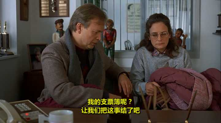 整个过程,分明就是一次捕猎行动。 有意思的是,前来买车的顾客也是一对夫妇。 他们百忙之中赶来,愤怒地对杰瑞说你是个骗子。和杰瑞不同,这位丈夫还没有遭遇难以对妻子启齿的财务危机。 如果我们以更宽泛的视角看待这场戏,这对夫妻的存在似乎也可以视为对杰瑞家庭关系的某种评判。毕竟这个时候,杰瑞就坐在对面一脸无所谓的装傻,轻车熟路地把对方当成傻瓜糊弄。 或许对方的夫妻关系,特别是丈夫从妻子的暴力掏出支票簿的动作,也能令他联想到自己的家庭。 |